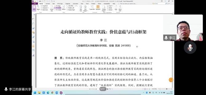 李江同学汇报内容:循证为教师教育实践提供了新的阐释视角。研究分为四部分。第一部分,传统教师教育实践的困厄及其发展羁绊:单一的线性范式,目标旨向应试化、内容框架抽象化、过程标准技艺化和考核评价同质化等发展羁绊。第二部分,从彰显师生主体性价值、达成教育规范性价值和推进实践创新性价值等三个方面探讨了循证教师教育实践的价值。第三部分,循证教师教育实践的行动框架:“双层循环”实践框架。第四部分,余论,提醒我们重视“二阶反思”以打造循证教师教育实践的合力发展生态圈。