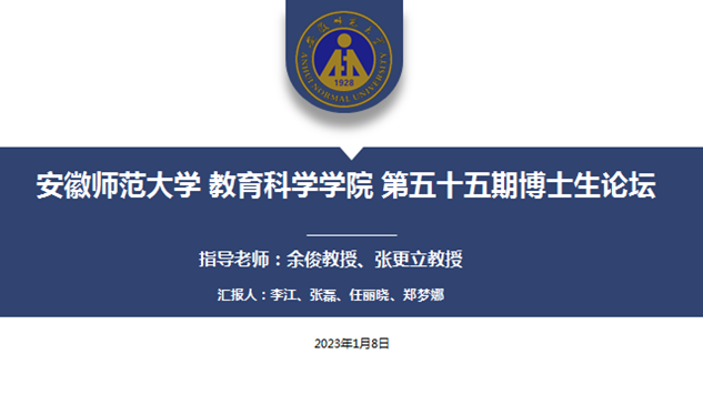 2023年1月8日14:00—17:10,教科院教育学专业第五十五期博士论坛依托腾讯会议(会议号:956-646-007)在线开展。本次论坛的指导教师为余俊教授、张更立教授,李江、张磊、任丽晓、郑梦娜四位博士生就最近的科研成果分别进行汇报。我院共38位教师和博士生参加了本期论坛。