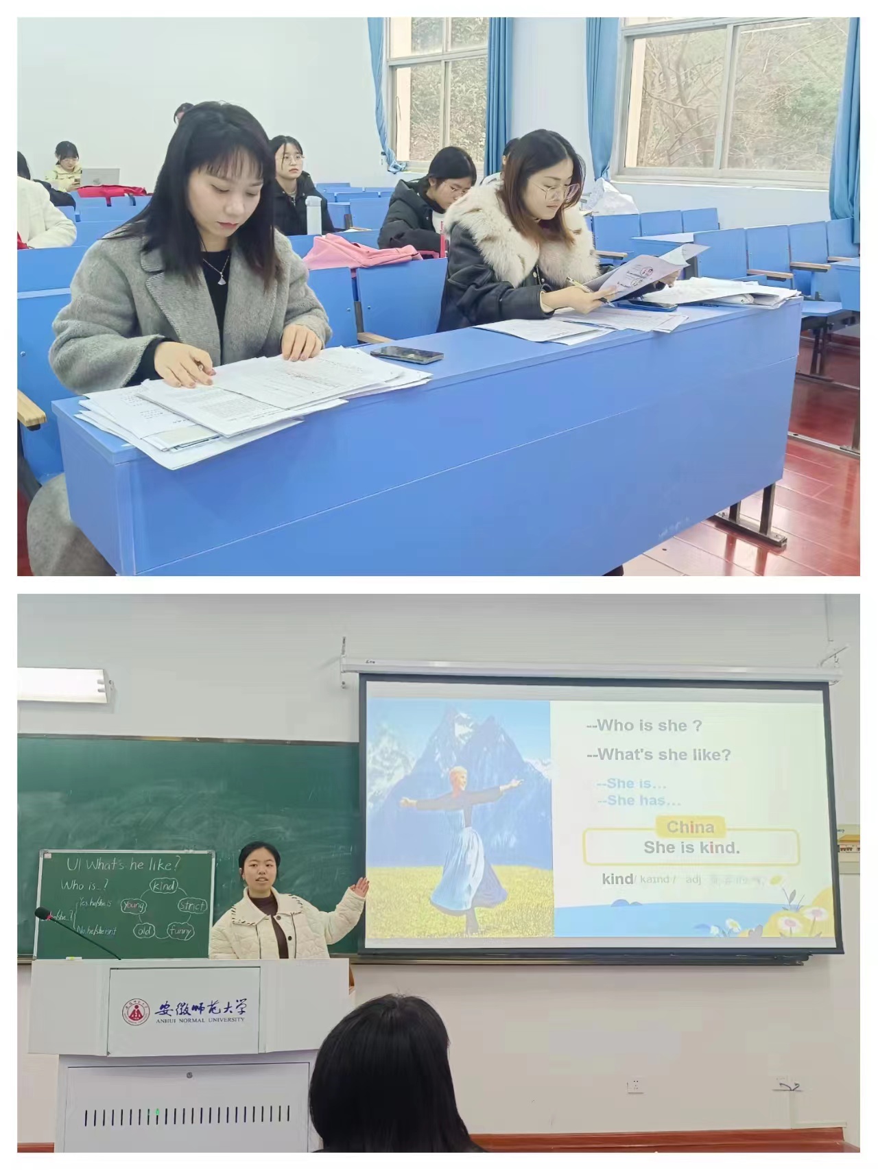 本网讯(教科院 张玉婵)为进一步提升小教(复合型)专业方向课程群的建设质量,打造集理论与实践于一体的专业核心课堂,全面提高学生的综合素质和教学技能,2月20日至2月24日,小学语文课程与教学论、小学数学课程与教学论、小学英语课程与教学论三门课程先后在教学楼1301教室、1206教室开展期末教学实践考核。本次教学实践考核由三门课程任课老师具体组织实施,其中《小学语文课程与教学论》的负责教师是陈娜、程洁老师,《小学数学课程与教学论》的负责教师是马兴、王立蓉老师,《小学英语课程与教学论》的负责教师是陈晨、周雅琴老师,并安排了相应的计分助教。小学教育(复合型)专业全体学生参与考核。