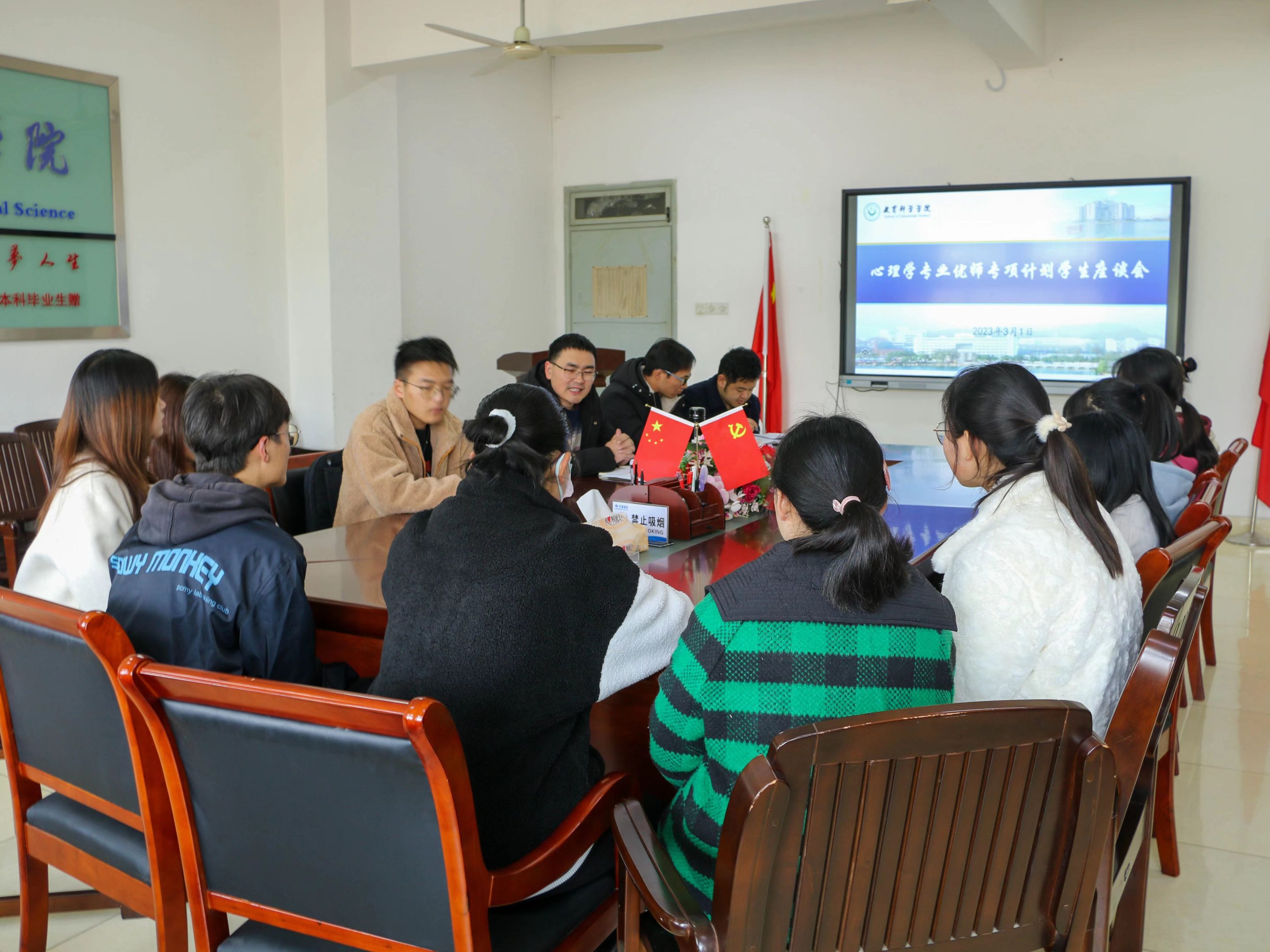 本网讯(教科院)近日,心理学(师范)专业优师专项计划学生座谈会在学院308会议室举行。学院副院长韩建涛、心理学专业负责人王礼军、班主任谢宇以及2022级优师专项计划学生参加会议。座谈会由韩建涛主持。