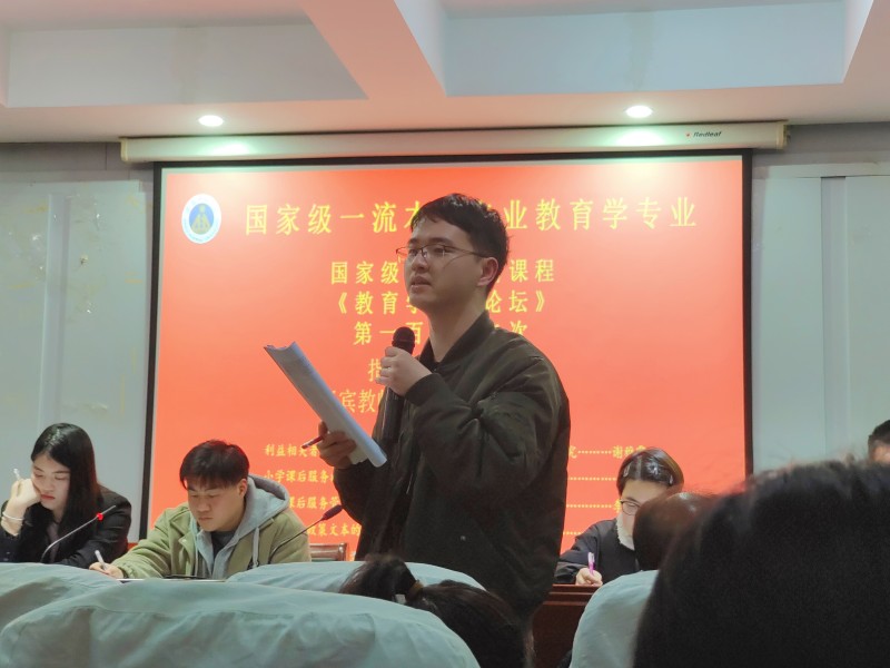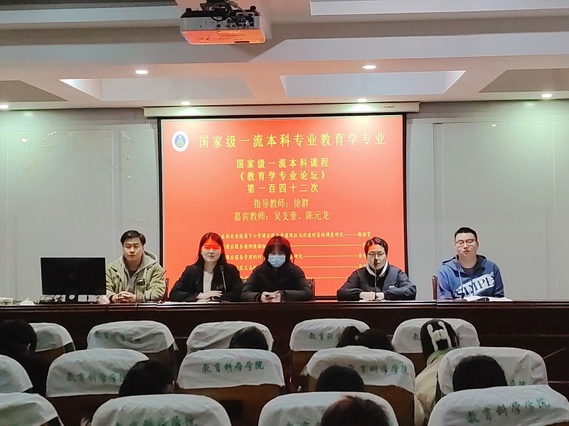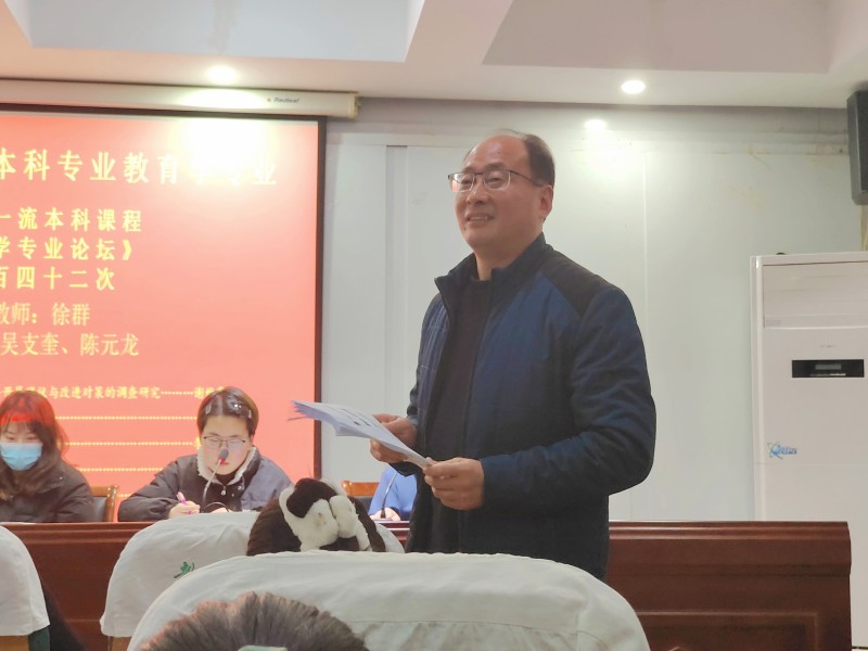 本网讯(文/谢雅雯 乔琳颖 图/乔琳颖)3月19日晚,在365英国上市官网三楼学术交流中心,国家级一流本科专业建设点教育学专业顺利举办第一百四十二次专业论坛。莅临本次专业论坛有小组指导教师徐群以及嘉宾教师吴支奎和陈元龙,20级、21级教育学专业全体本科生到场参加,并由20级教育学王悦晓担任主持人。