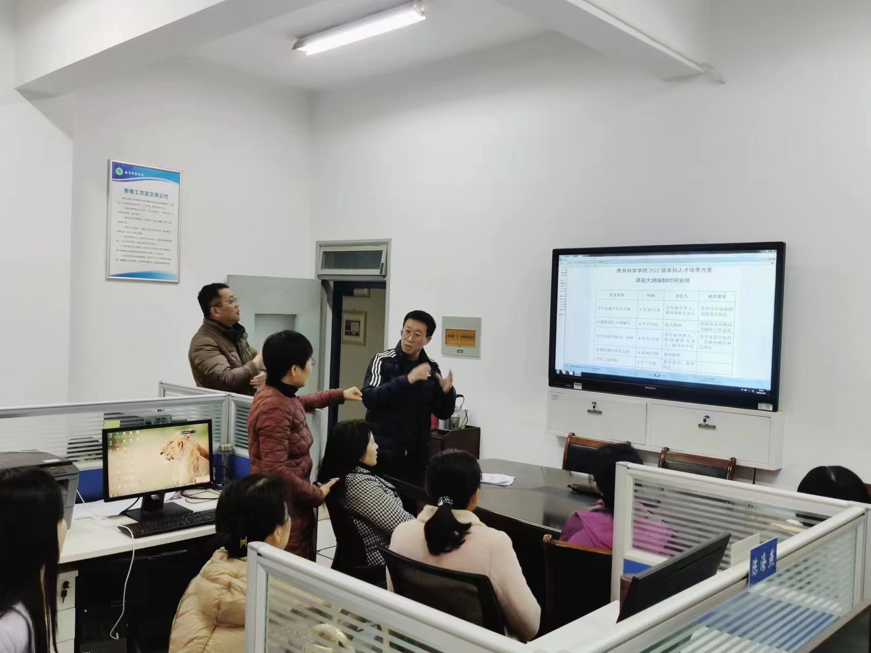 王成刚介绍了2022版学前教育专业本科人才培养方案有关课程的调整情况,并布置了课程大纲修订的时间安排。并就如何结合学前教育国家一流专业建设与继续推进专业认证,围绕培养方案中的课程设置、学时和学期安排、教学方式和考核方式等方面的变化,有针对性的开展2022版课程大纲的修订工作与专业各位教师进行了深入的研讨。
