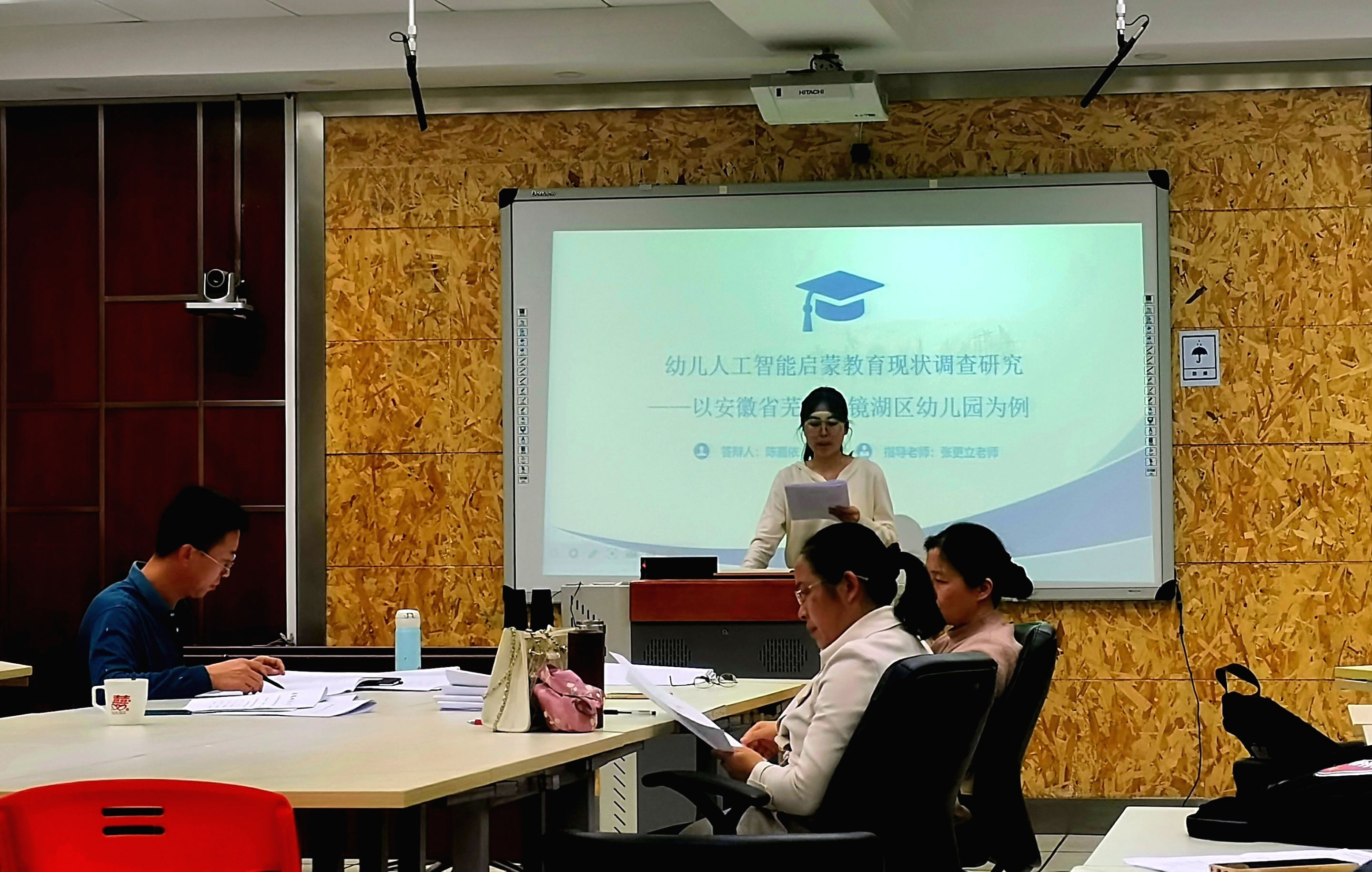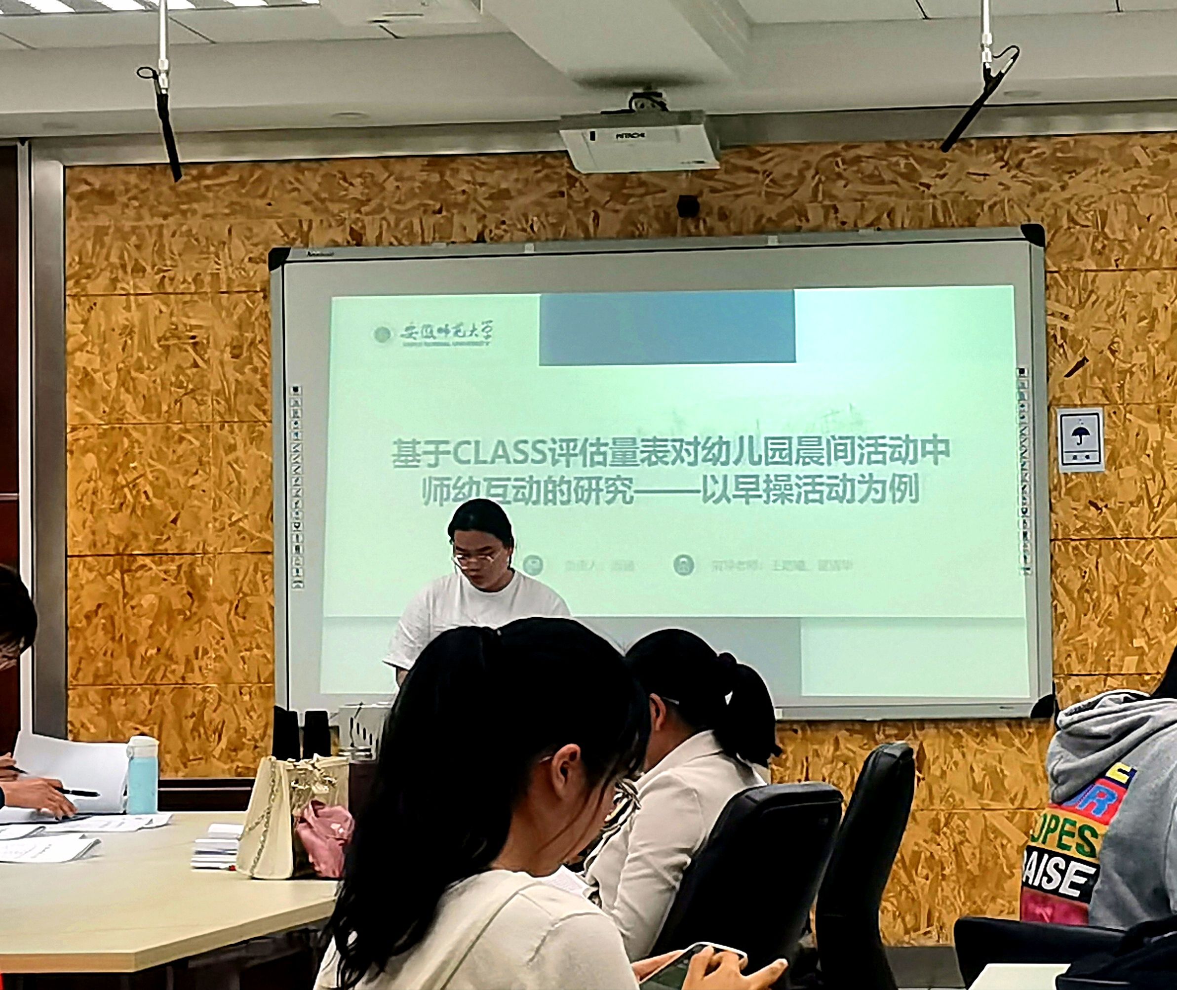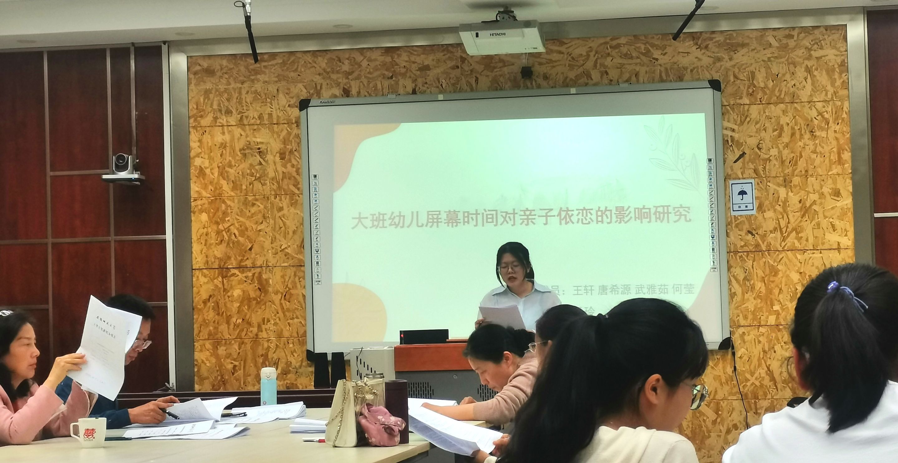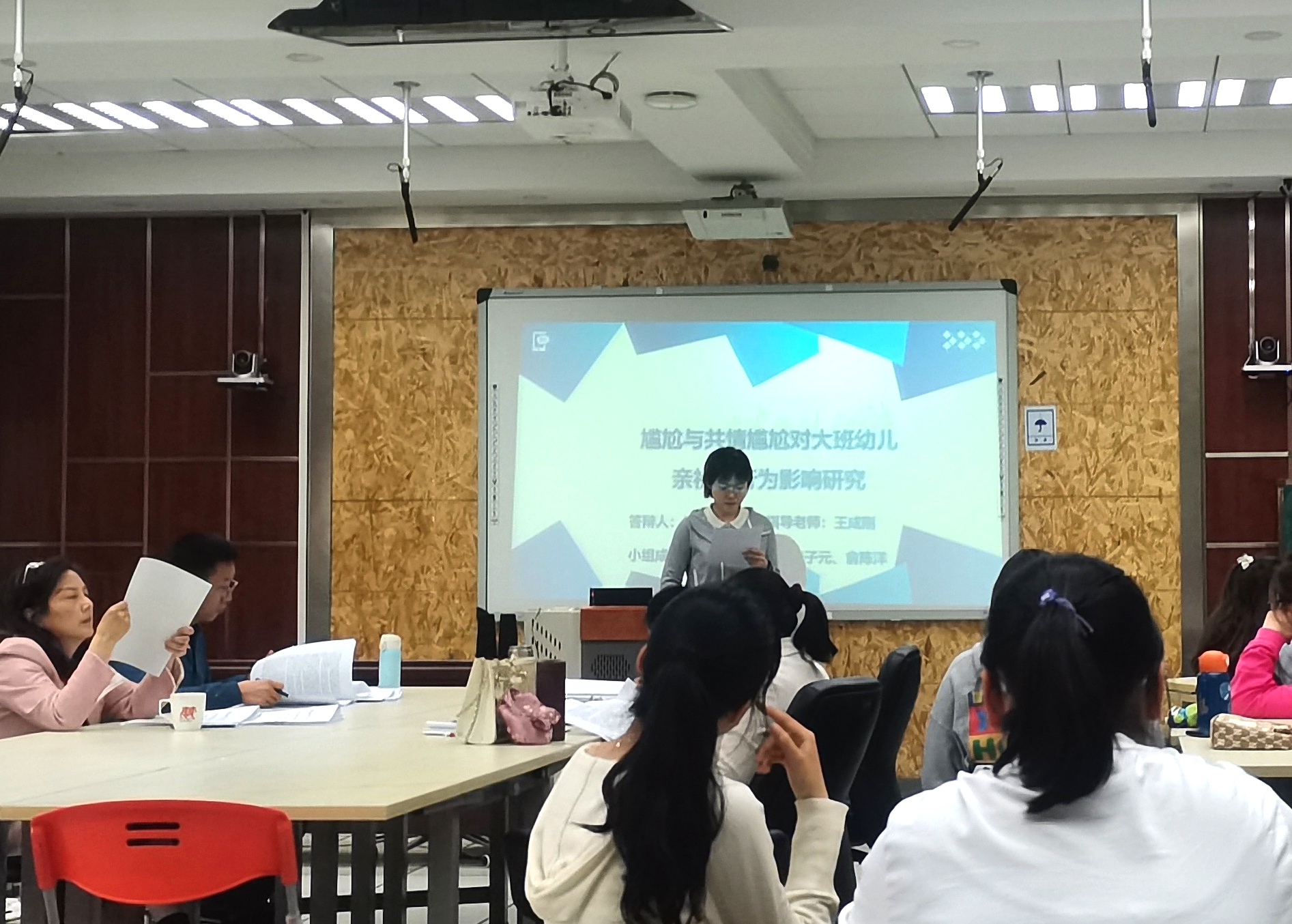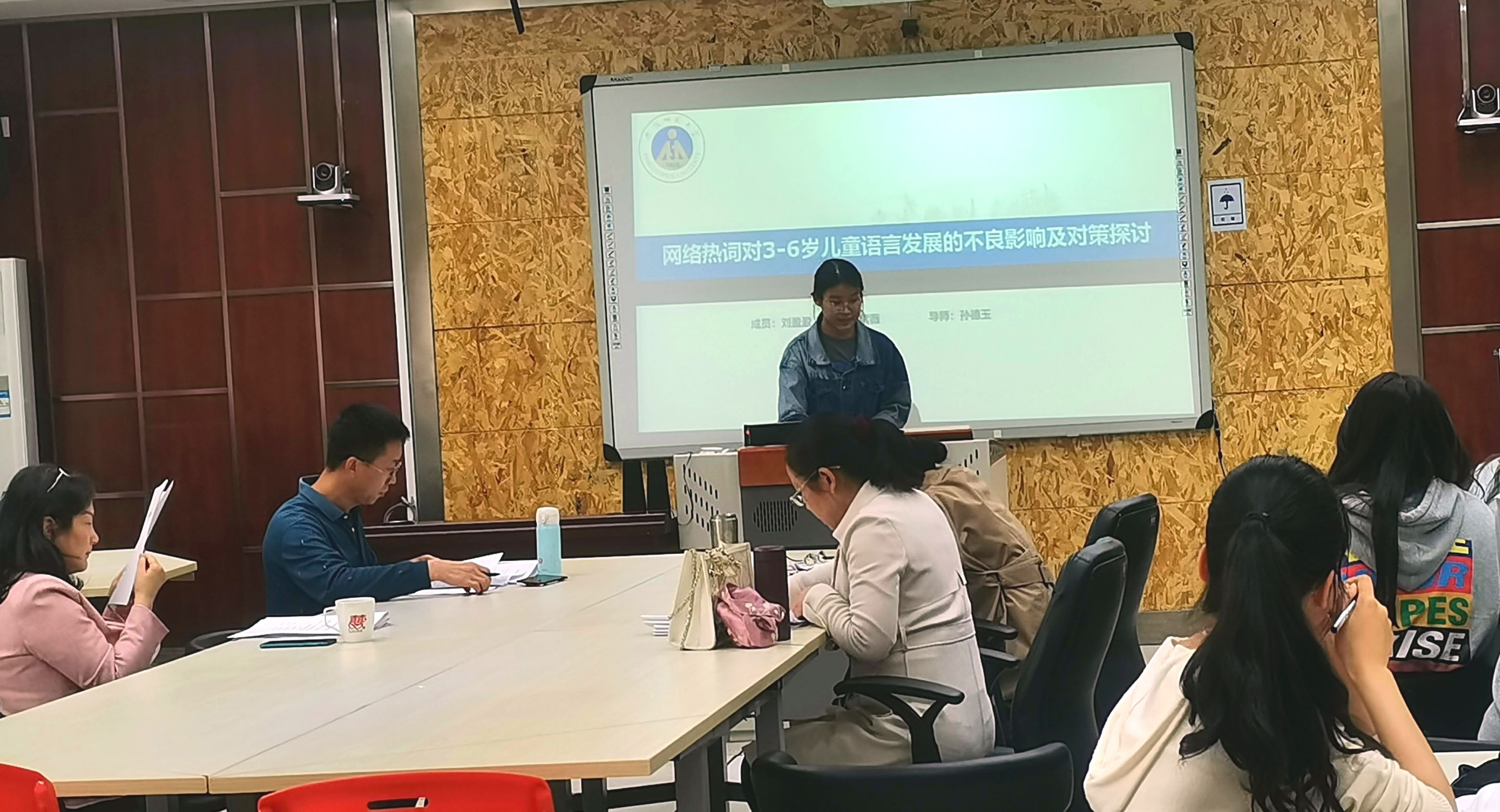 本次答辩会共有6个国家级项目小组参加,参加答辩的选题多样,涉及儿童语言发展、社会性发展、师幼互动、亲子依恋、人工智能等。现场答辩流程分为学生PPT陈述、教师提问、学生作答三个环节,各项目汇报人从项目背景、研究过程、研究内容、项目成果等方面进行汇报。