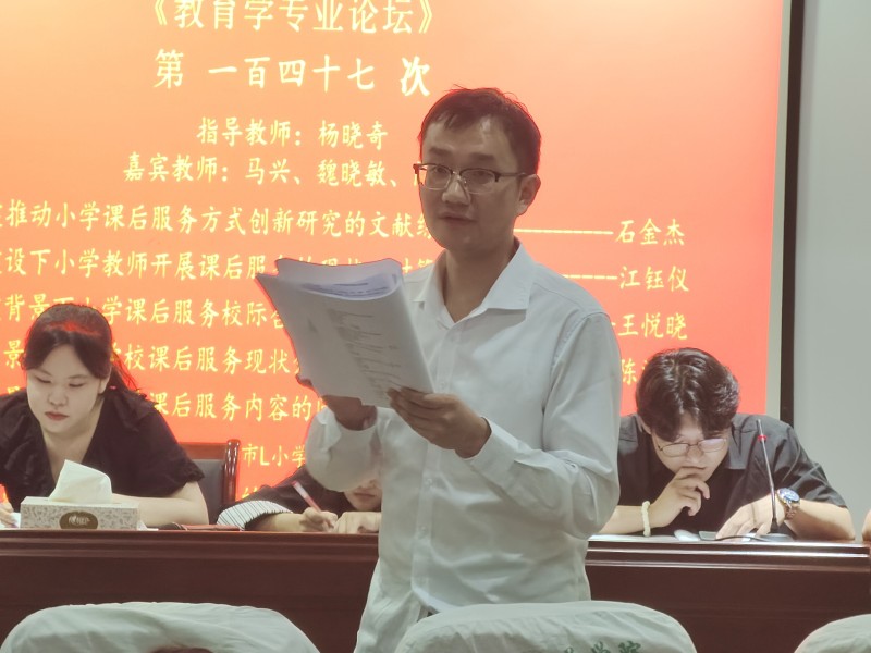 第四位汇报人陈海龙根据《“双减”背景下小学学校课后服务现状分析与改进策略》这一主题,借助问卷法和访谈法,探究小学学校课后服务现实状况,并从实施理念、实施机制和评价系统三个方面归纳小学课后服务现存问题并提供改进策略。第五位汇报人王琪森以《“双减”背景下乡村小学课后服务内容的问题与对策研究——以A省F市L小学为例》为题,以一所乡村小学为调查对象,分析乡村小学课后服务存在问题及产生原因,并提出针对性的解决对策。第六位汇报人王甜甜围绕《“双减”政策背景下小学课后服务的城乡差异比较研究》的主题进行汇报,综合运用问卷法、访谈法以及观察法调查两所城乡小学课后服务开展现状,并进一步分析城乡差异产生的原因,提出相应改进措施。