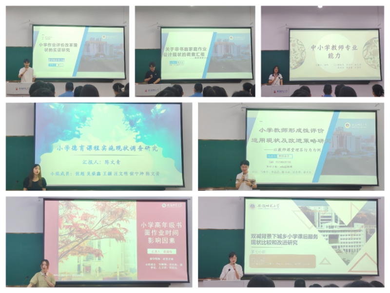 21级第一组的汇报主题是《双减背景下小学低年级非书面家庭作业设计现状调查研究》,指导教师为吴支奎,从现存问题、数据呈现、原因分析、调研体会与反思四个部分对调研成果进行汇报。21级第二组的汇报主题是《小学作业评价改革现状的调查研究》的主题,指导教师为阮成武,从确定选题、查找资料、调查工具设计、调查实施、资料分析、反思改进六个方面展开汇报。21级第三组的汇报主题是《中小学教师专业能力现状调查研究》,指导教师为柳丽娜,重点从主题确定、文献综述、问卷编制和访谈提纲撰写进行汇报。21级第四组的主题是《小学德育课程实施现状调查研究》,指导教师为杨俊铨,主要汇报小组的选题过程与调研工具的设计完善。21级第五组的主题是《小学教师课堂形成性评价运用现状及改进策略研究—以课堂理答行为为例》,指导教师为江珊,从学生、教师和学校三个主体出发,介绍小学教师形成性评价的运用现状及原因。21级第六组的主题是《小学高年级书面作业时间现状及其影响因素调查研究》,指导教师为徐赟,围绕调研主题、导师指导、学校特色活动和有待深入研究的问题展开汇报。21级第七组的主题是《双减背景下小学课后服务开展情况城乡比较研究》,指导教师为陈元龙,从选题缘由、研究设计、实地调研、对策建议和总结反思进行汇报。