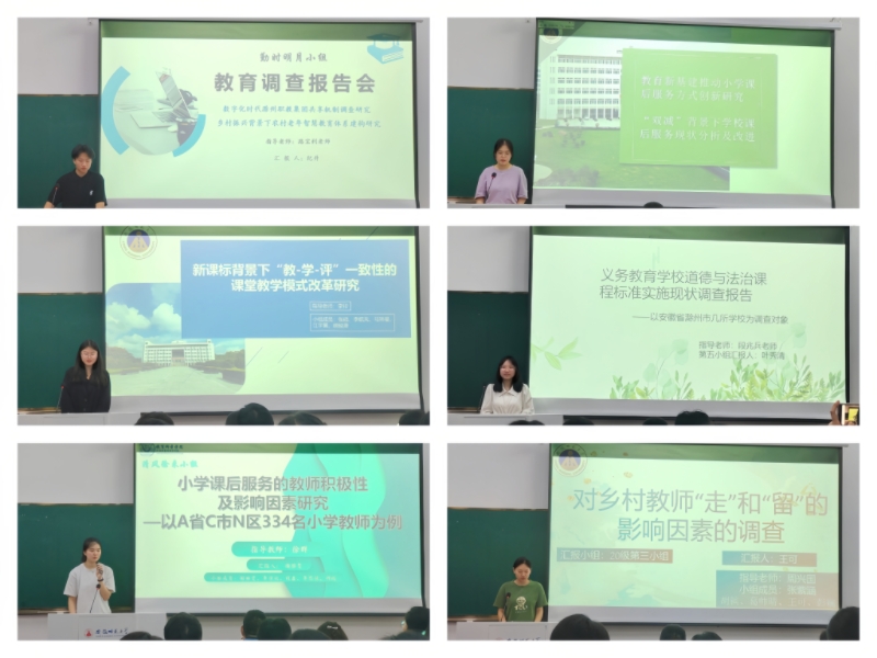 20级第一组的汇报主题是《义务教育阶段思想政治教师实施课程标准现状调查研究》指导教师为段兆兵,重点从调研现状、调研结果和对策建议三方面展开汇报。20级第二组的汇报主题是《数字化时代下职教集团共享机制研究》和《乡村振兴战略背景下安徽省老年智慧教育体系构建》,指导教师为路宝利,主要从前期准备、正式调研和反思总结三方面展开汇报。20级第三组的汇报主题是《乡村教师留得住的影响因素研究》,指导教师为周兴国,从前期准备的流程、调研报告的呈现和研究问题的反思三方面展开汇报。20级第四组的汇报主题是《新课标背景下“教-学-评”一致性的课堂教学模式改革研究》,指导教师为李卯,围绕研究设计、调研过程、调研成果、问题分析以及建议对策五个方面进行汇报。20级第五组的汇报主题是《教育新基建推动小学课后服务方式创新研究》和《“双减”背景下学校课后服务现状分析及改进》,指导教师为杨晓奇,主要通过调研数据,总结课后服务的形式、内容与组织情况。20级第六组的汇报主题是《小学课后服务的教师积极性及影响因素研究》,指导教师为徐群,重点从研究思路、中期调研、后期数据分析与研究结论、总结展望四个部分展开汇报。