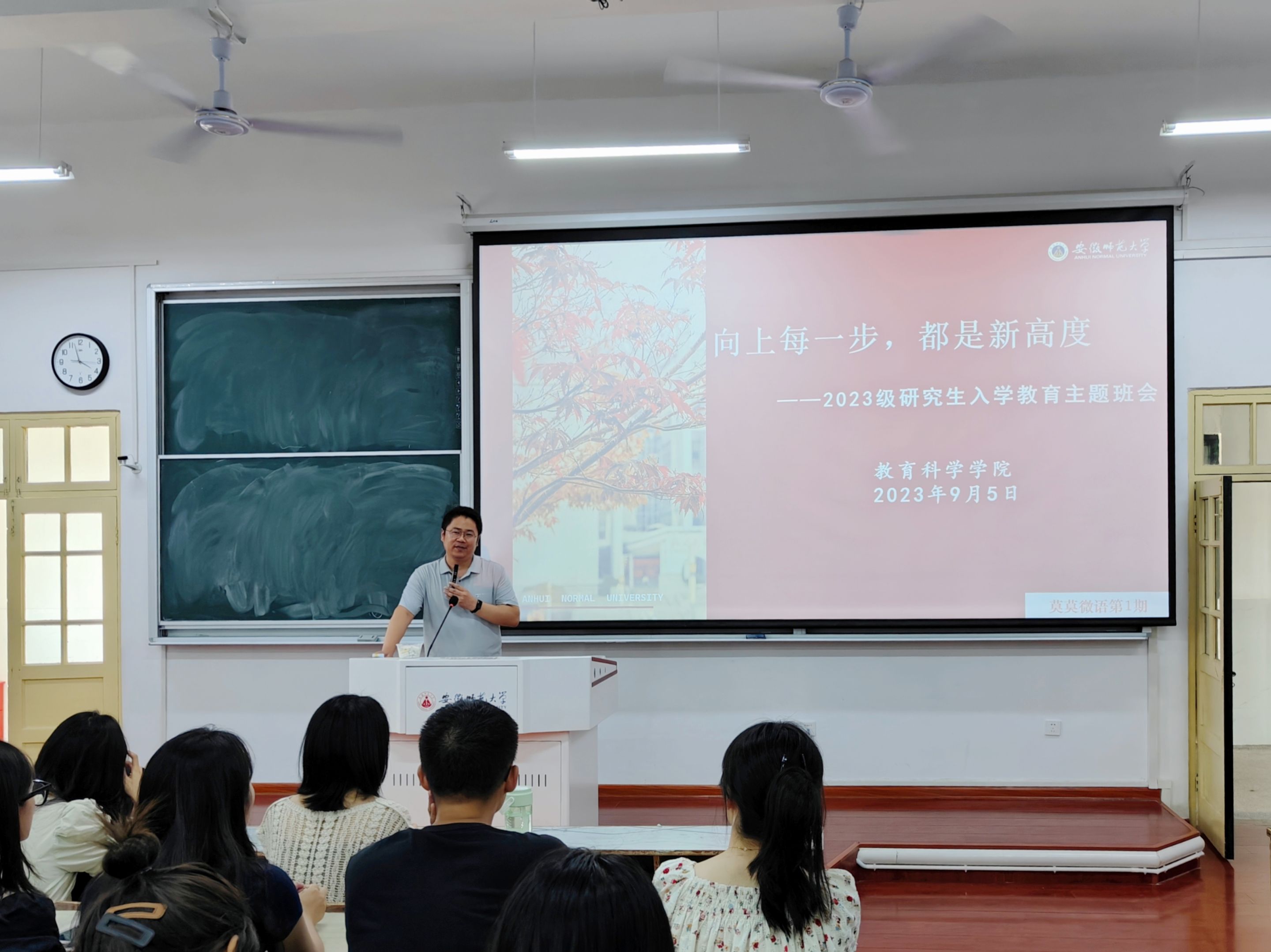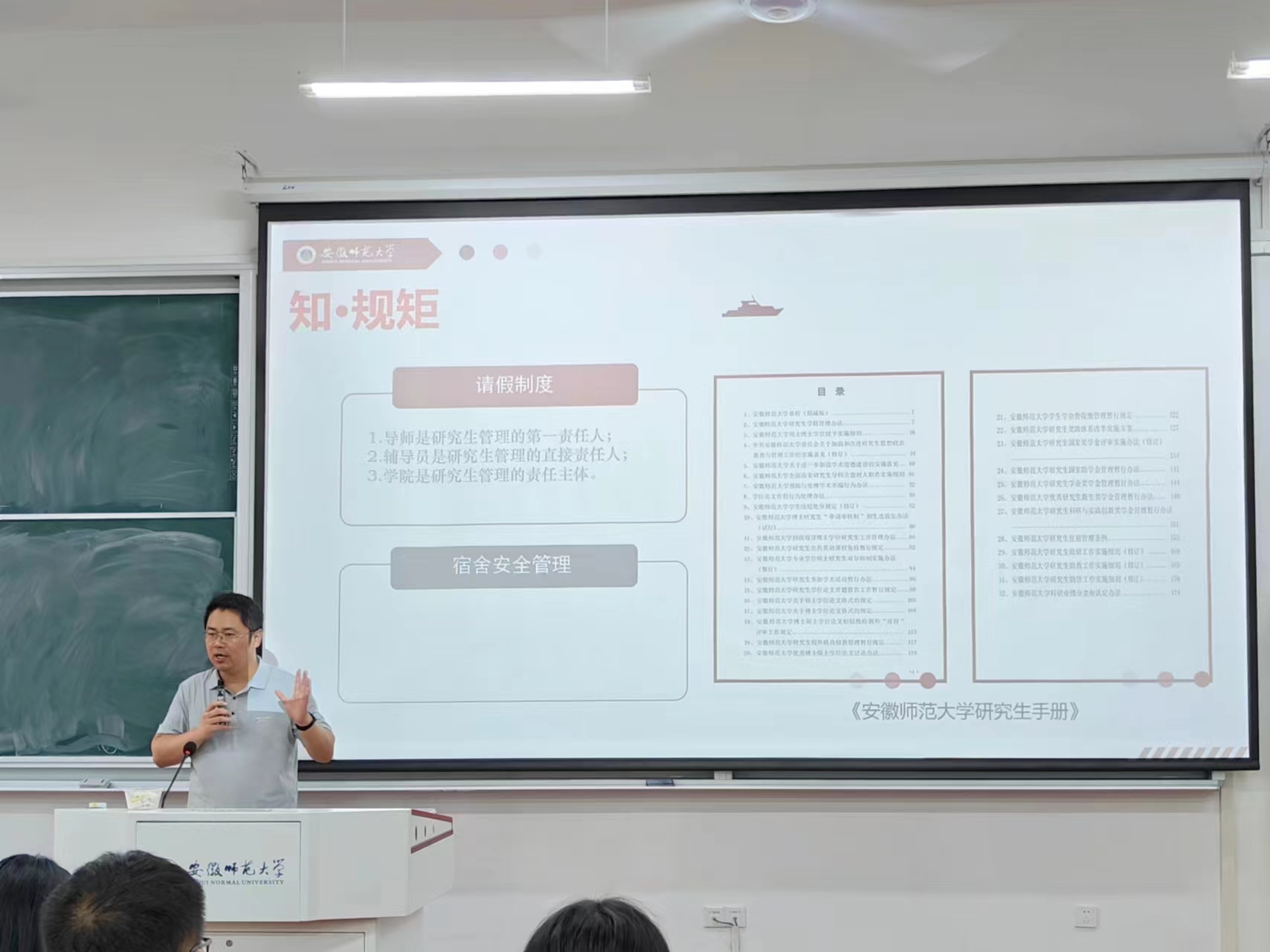 莫大贡从知人、知事、知规矩,思研、思已、思规划等方向介绍了即将开启的研究生生活。他引导同学们主动思考“什么是研究生?”“研究生学习与本科生学习的区别在哪里?”“我的研究生生涯如何度过?”在安全教育环节,莫大贡重点介绍了请假制度、宿舍管理规定和安徽师范大学学生管理“四项禁令”,希望全体研究生知制度、守规矩,平安度过三年的学习生涯。