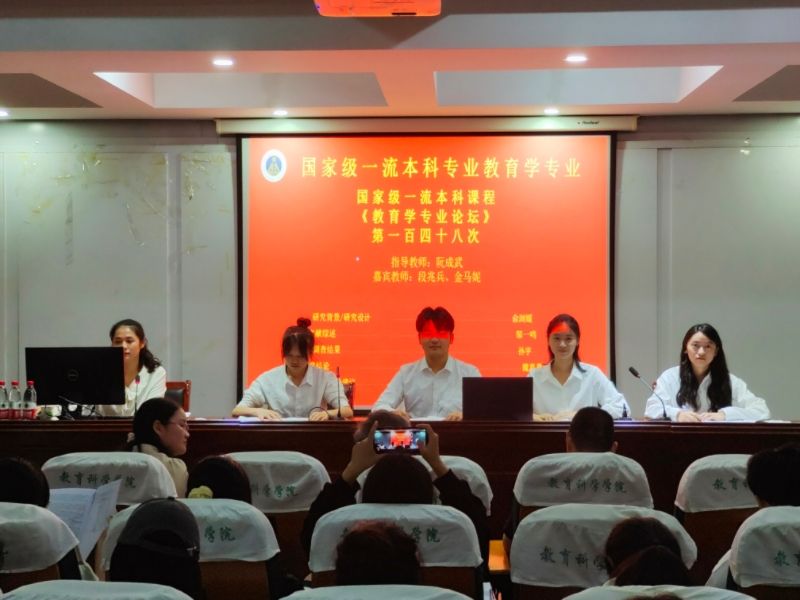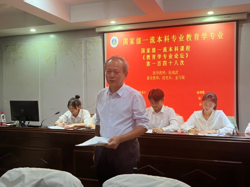 9月24日晚,国家级一流本科专业建设点教育学专业第一百四十八次专业论坛在学院三楼学术交流中心顺利举行。莅临本次专业论坛的有小组指导教师阮成武以及嘉宾教师段兆兵、金马妮,21级、22级教育学专业全体本科生到场参加,并由21级教育学咸欢欢担任主持人。