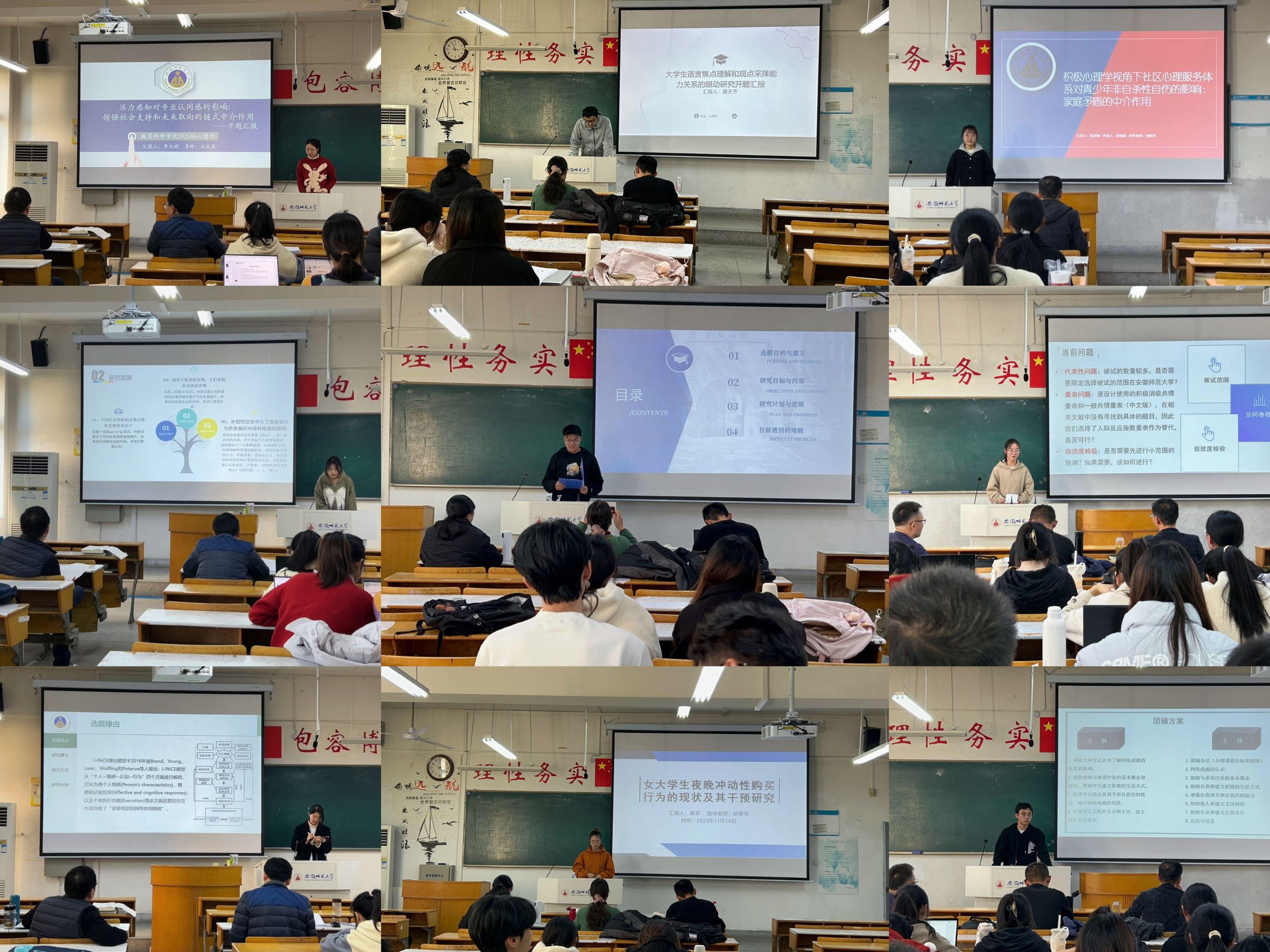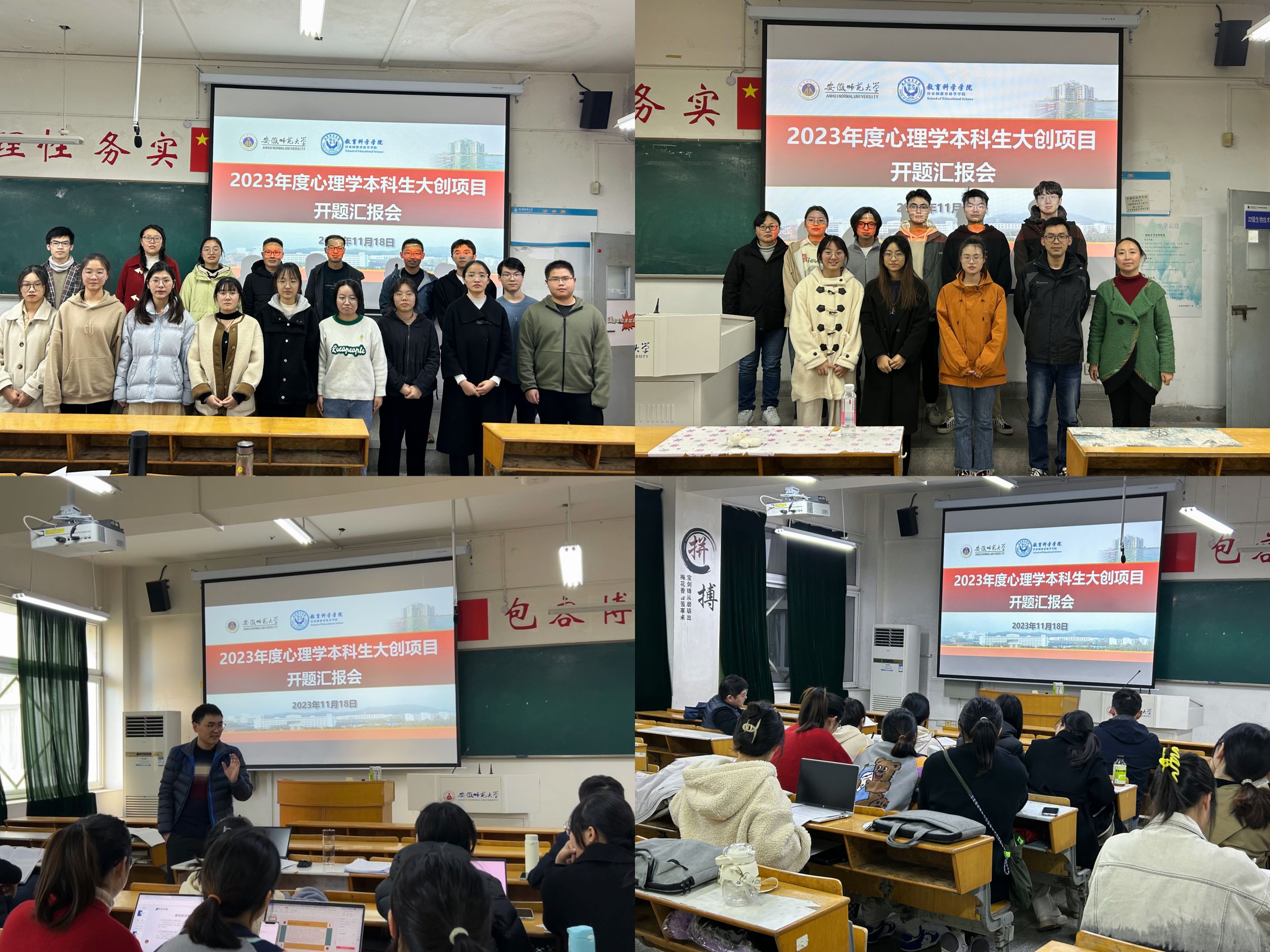 大学生创新创业训练计划项目是培养适应创新型国家建设需要的高水平创新人才的一种创业实践活动,对培养学生创新思维、提高学生实践能力有重要意义。为了帮助2021级心理学参与获批大创项目的同学更好地完成课题,心理学专业于2023年11月18日下午开展了2023年度大创项目开题答辩会。答辩分成三组,担任本次开题答辩会的指导教师有韩建涛、全莉娟、王礼军、孙文强、舒首立、彭苏浩、刘田田、万振东、金剑等专业老师,2021级心理学专业大创项目立项学生全员参与。