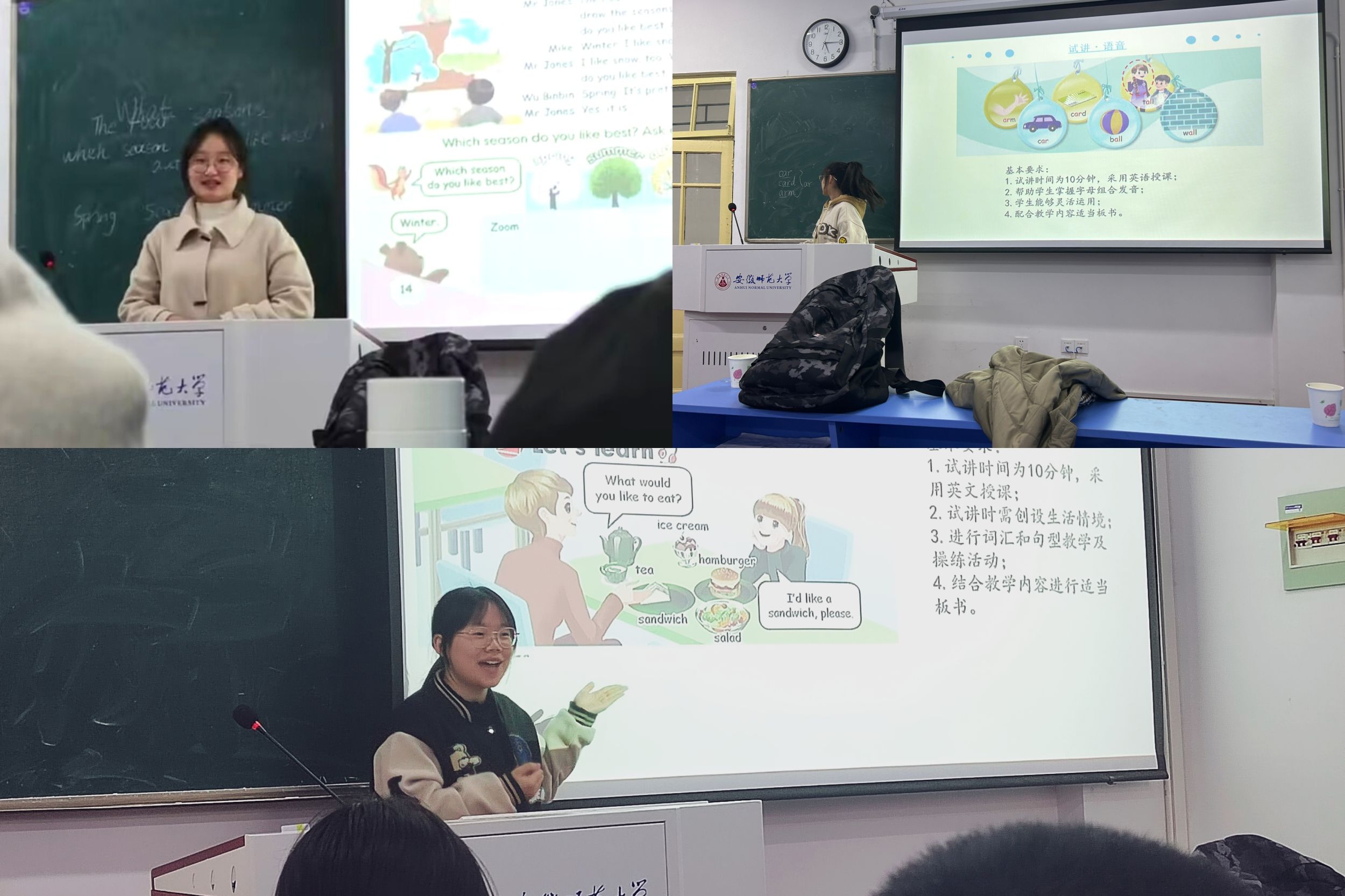 英语学科指导教师方克宇首先以打招呼和小短文的形式导入对教资面试的介绍,并亲自示范如何在课堂上拉近与学生之间的关系。之后,他从结构化问题的内容、试讲题目的分析及答辩技巧三方面展开分享,并鼓励同学们在英语教学中融合“听说读写看”。同时,方克宇向同学们推荐了结构化和可视化教学图,并提醒大家重点关注面试的注意事项。在无生授课的模拟环节,陈玉洁、陶佳和陈伊婷三位同学分别进行了试讲。方克宇进行点评并提出三点建议:首先,小学应多用why和how对学生进行启发;其次,词汇课可以尝试自己画简笔画;最后,单词的讲述应根据音节,利用词卡辅助教学,“以旧带新”学习新单词。