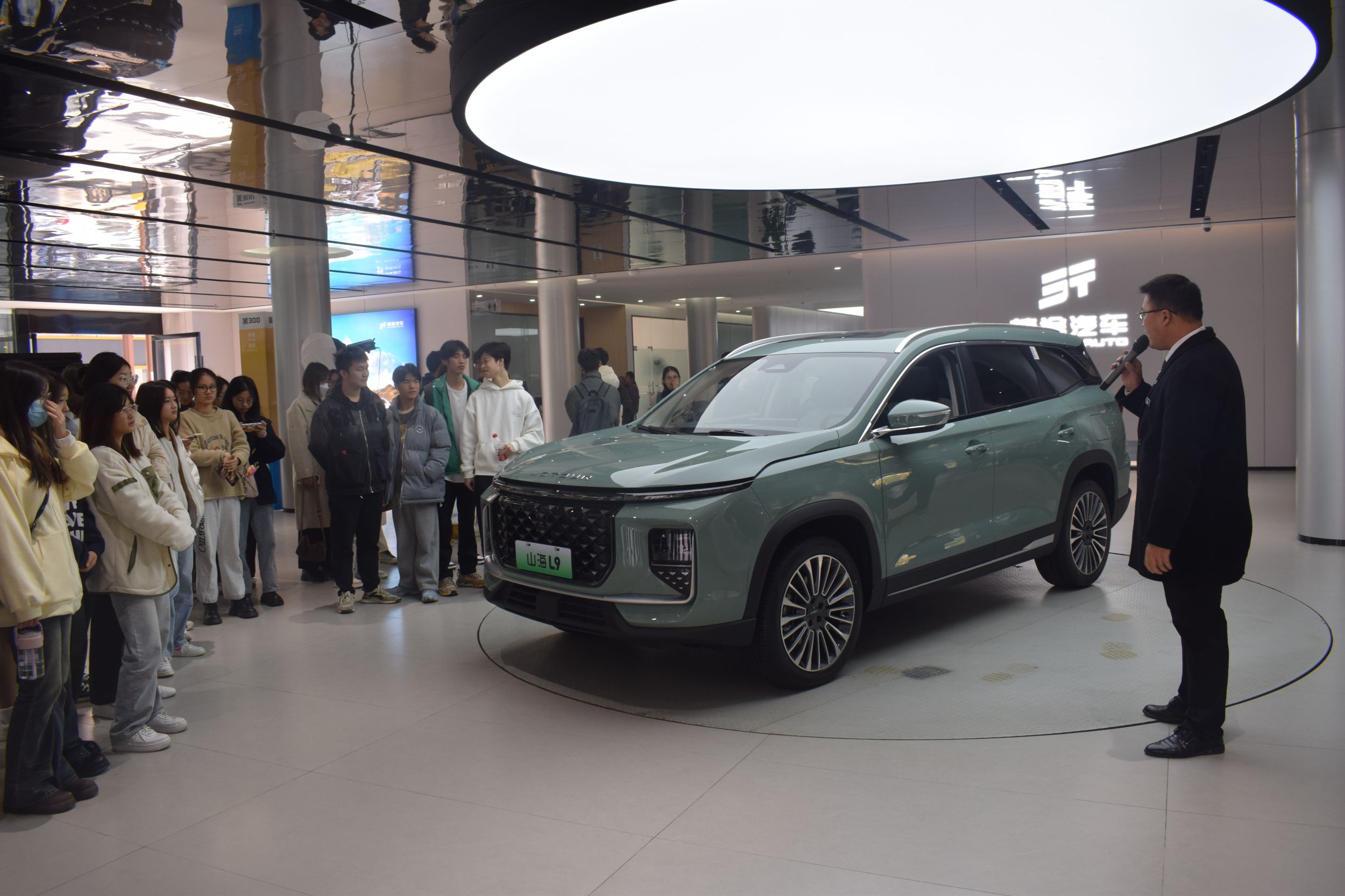 在捷途汽车直营中心,相关负责人为全体师生介绍了当下捷途汽车热售的汽车类型以及特色亮点,并邀请大家近距离观摩。大家在观摩过程中,结合心理学基础知识运用及销售心理学、用户体验等相关内容进行交流互动。