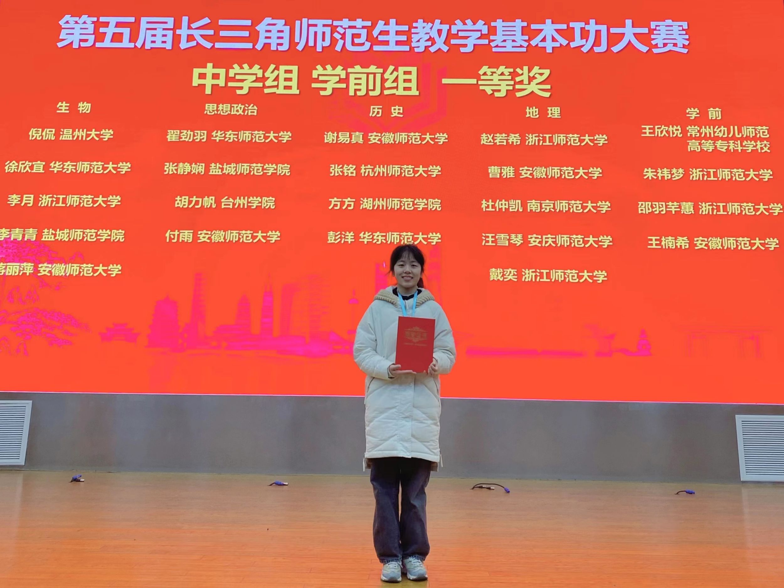 比赛由三省一市教育主管部门及长三角教师教育联盟六所成员单位所推荐的学校合计328人参赛,其中,学前组共17人。365英国上市官网学前教育专业的王楠希同学在大赛中喜获学前组一等奖!