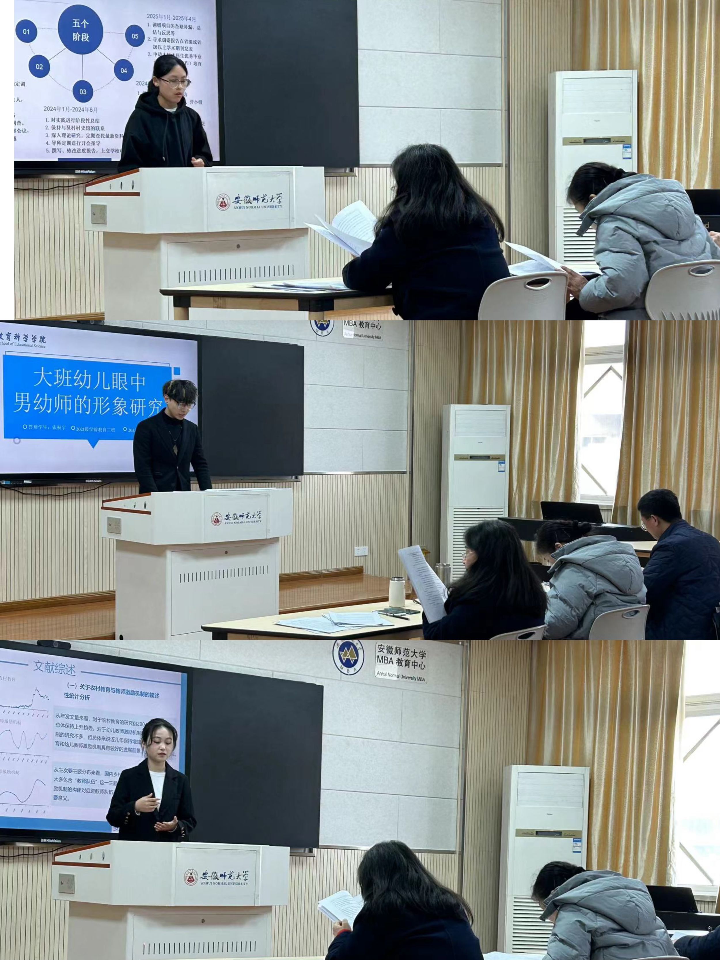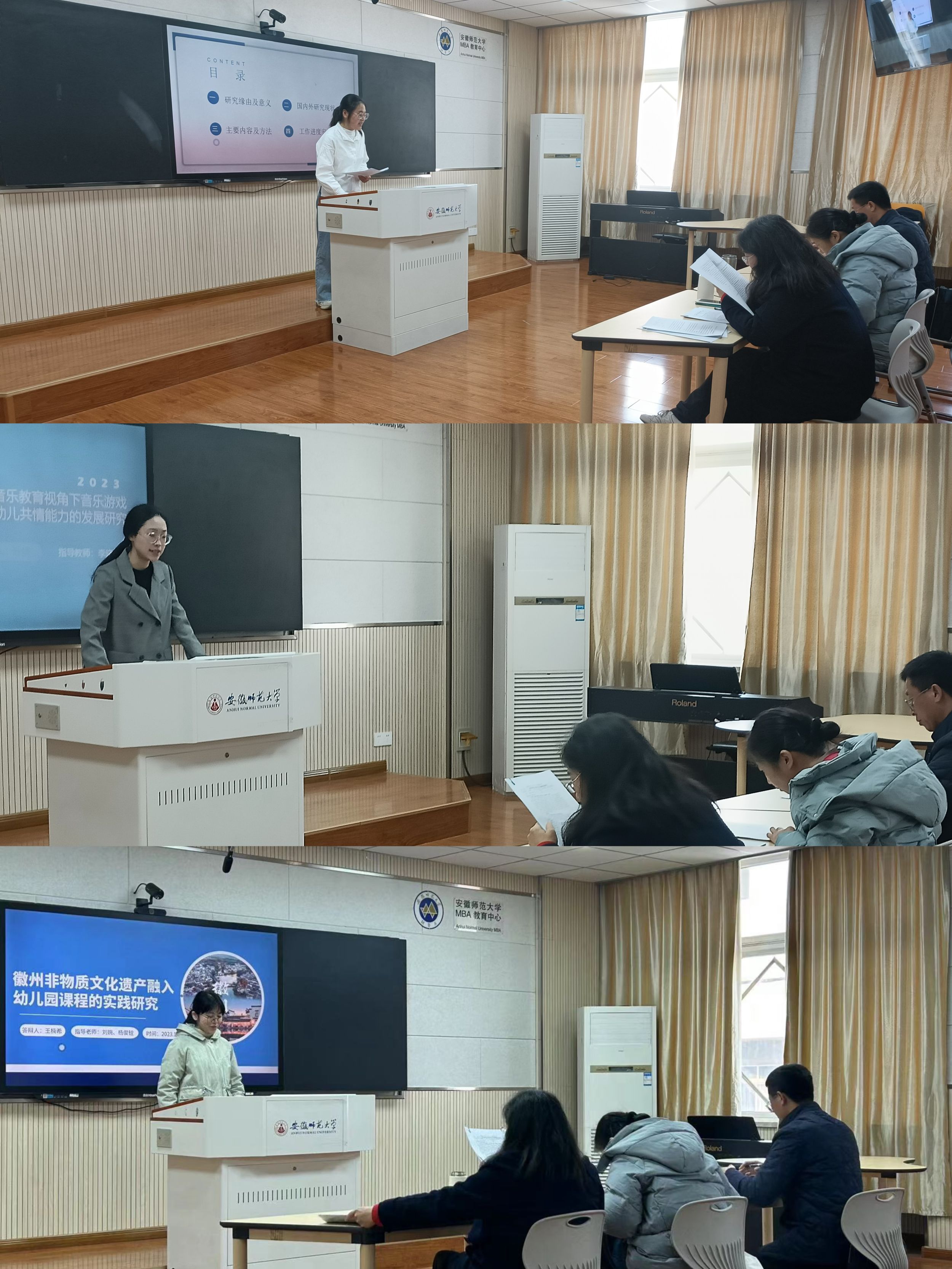 开题汇报的六位成员柳倩芸、何艺、张桐宇、姚薇薇、叶婧、王楠希依次围绕《课后延时服务政策在幼儿园执行的实然现状研究》《乡村振兴背景下幼儿教师激励机制研究——以芜湖地区为例》《大班幼儿眼中的男幼师形象》《“家-园-馆”乡土幼教模式的实践研究》《奥尔夫音乐教育视角下音乐游戏对中班幼儿共情能力的发展研究》《徽州非物质文化遗产融入幼儿园课程的实践研究》展开汇报,项目研究内容覆盖广泛,研究方法各不相同。三位老师在听完每个小组汇报后,分别就相关项目的相关问题展开提问,并针对项目选题的可行性、研究对象的选择、研究方法的使用等方面进行了细致点评与深入指导,为项目成员后续研究的开展指明了改进方向。