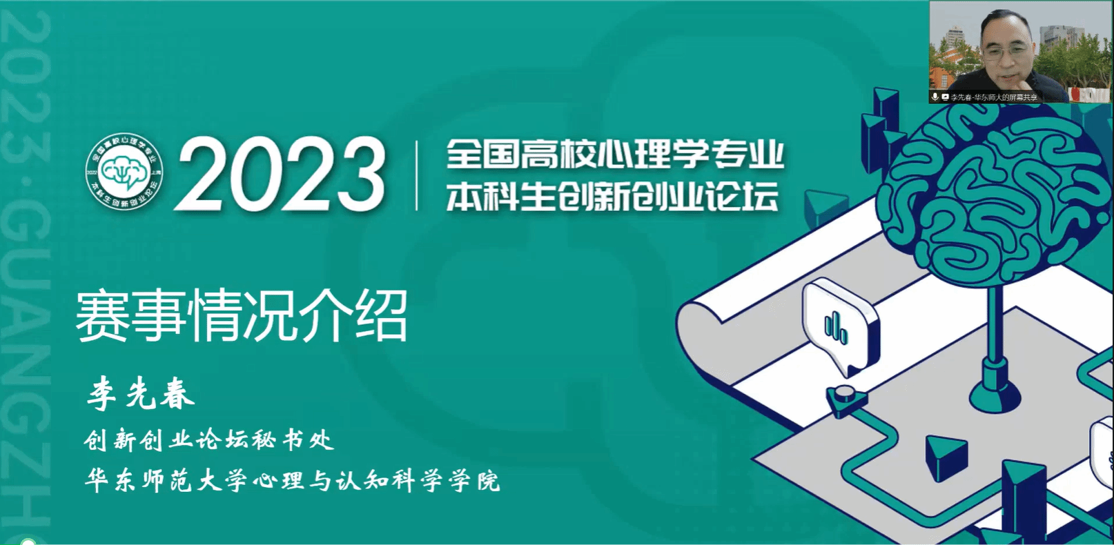 随后,李先春教授向与会师生详细介绍了创新创业论坛。他指出,本论坛由教育部高等学校心理学类专业教学指导委员会主办,其宗旨是落实立德树人根本任务,助力学生掌握基本理论、研究技能与实践应用,提升科学研究与实践转化能力,鼓励开展跨学科研究工作,加强团队合作精神,注重交流与沟通能力训练,展示心理学魅力与科研创新成果,传播产学研融合的最新理念,从而强化心理学解决关键科学问题和回应国家重大战略和社会需求的能力。同时,作为创新创业论坛的执行主席,李先春教授向大家详细介绍了论坛的主要流程与实施办法、各分论坛的开设思想与选拔主旨、本年度论坛的组织筹备情况与最新动态以及论坛的相关注意事项等;他还展示了自2020年12月以来论坛筹备工作组细致严谨的工作历程,以及前两届创新创业论坛的成绩,并指出前两届论坛中的相关作品充分展示了新时代我国心理学子们的扎实专业素养、创新思维与实践转化能力,也彰显了心理学解决关键科学问题和回应国家重大战略和社会需求的愿景和能力。