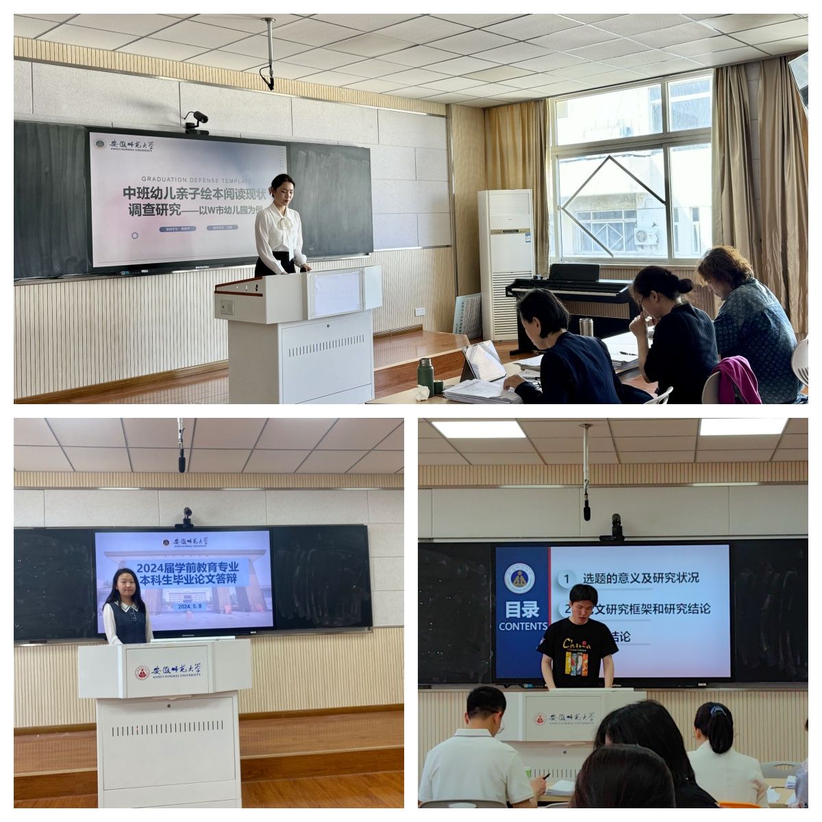 根据学校和学院毕业论文撰写安排的相关要求,学前教育专业本科生毕业论文工作撰写工作先后经历了论文选题、开题、调查、初稿、定稿、盲审、答辩等环节。在论文答辩环节,每组由三位老师做答辩评委,论文答辩遵循指导教师回避方式。答辩过程中,同学们先结合PPT阐述从选题缘由、研究意义、概念界定、研究方法和主要内容等方面做出阐述,答辩教师针对论文提出相关问题,并由该同学现场做出简短的回答,以考察该同学对论文的熟悉程度和对专业知识的掌握程度。各位答辩教师,并针对同学们的论文如何进一步修改提出了宝贵的建议,使大家更明确了需要改进的方面。