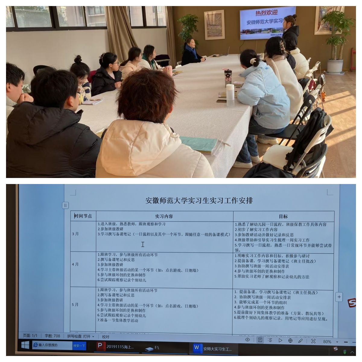 弋江区海上传奇幼儿园,在三楼多功能厅举行实习生欢迎仪式。杜园长对我院师生的到来表示欢迎。接着从幼儿园实习安排方面向各位同学介绍了幼儿园的实习流程和相关要求。