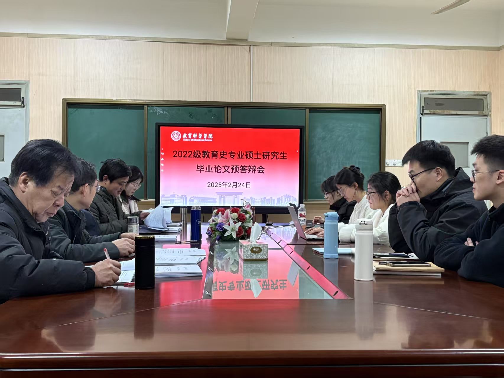 2025年2月24日下午,2022级教育史专业硕士研究生毕业论文预答辩在学院408会议室召开,孙德玉、李宜江、姚运标、杨俊铨、苏明明老师担任评审专家,会议由孙德玉老师主持。除参与本次预答辩会的硕士研究生外,20232024级教育史专业硕士研究生参与旁听。