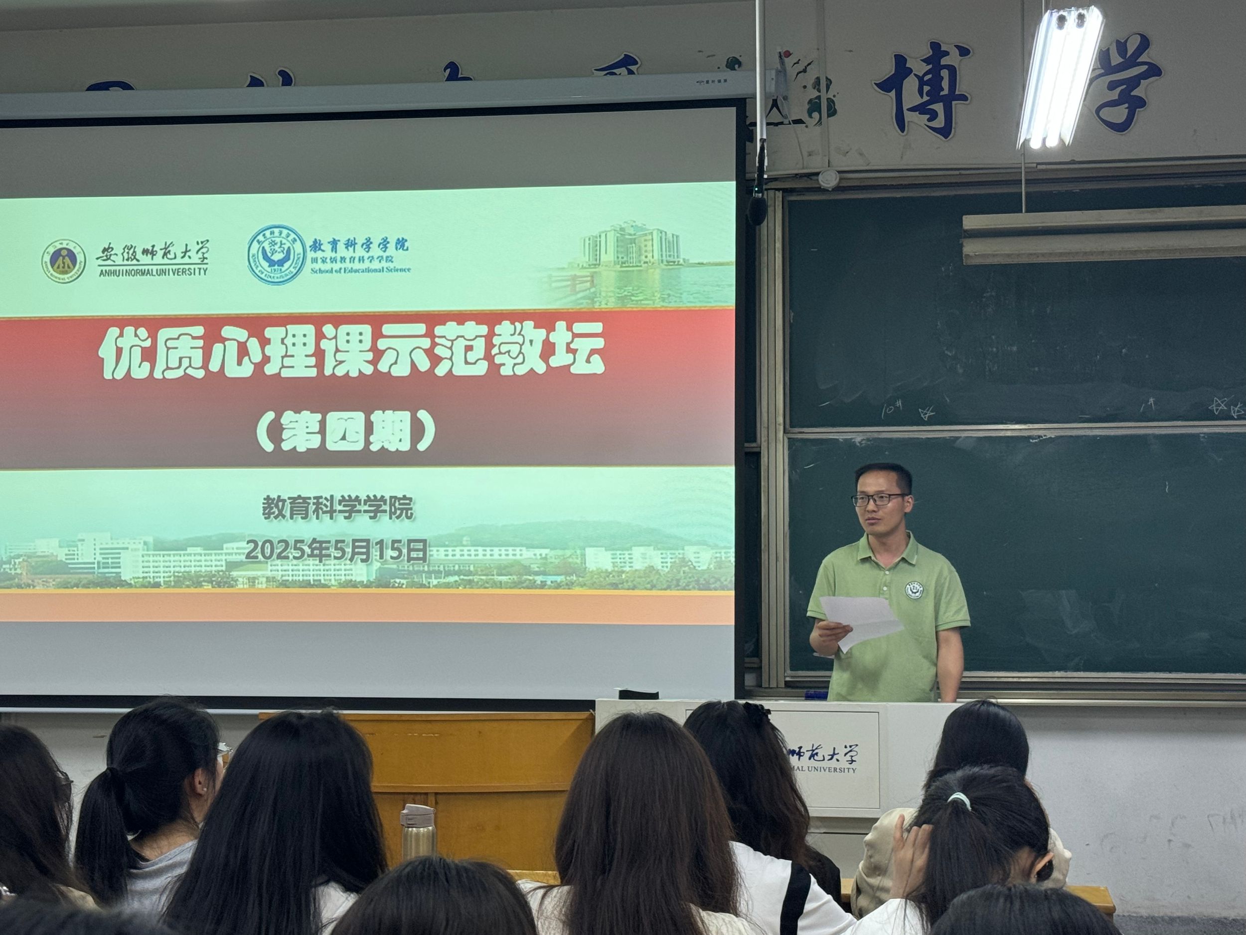 为提高心理学师范生的心理健康教育能力,全面提升心理育人实效,心理学专业于5月15日在赭山校区田楼8302教室举办第四期“优质心理课示范教坛”活动,以沉浸式教学示范引领学生探索心理课堂的育人魅力。本次活动特邀安徽师大附中德育副主任、中学高级教师谢莉担任主讲嘉宾,由心理学专业负责人王礼军主持,2023、2024级全体本科生参与活动。