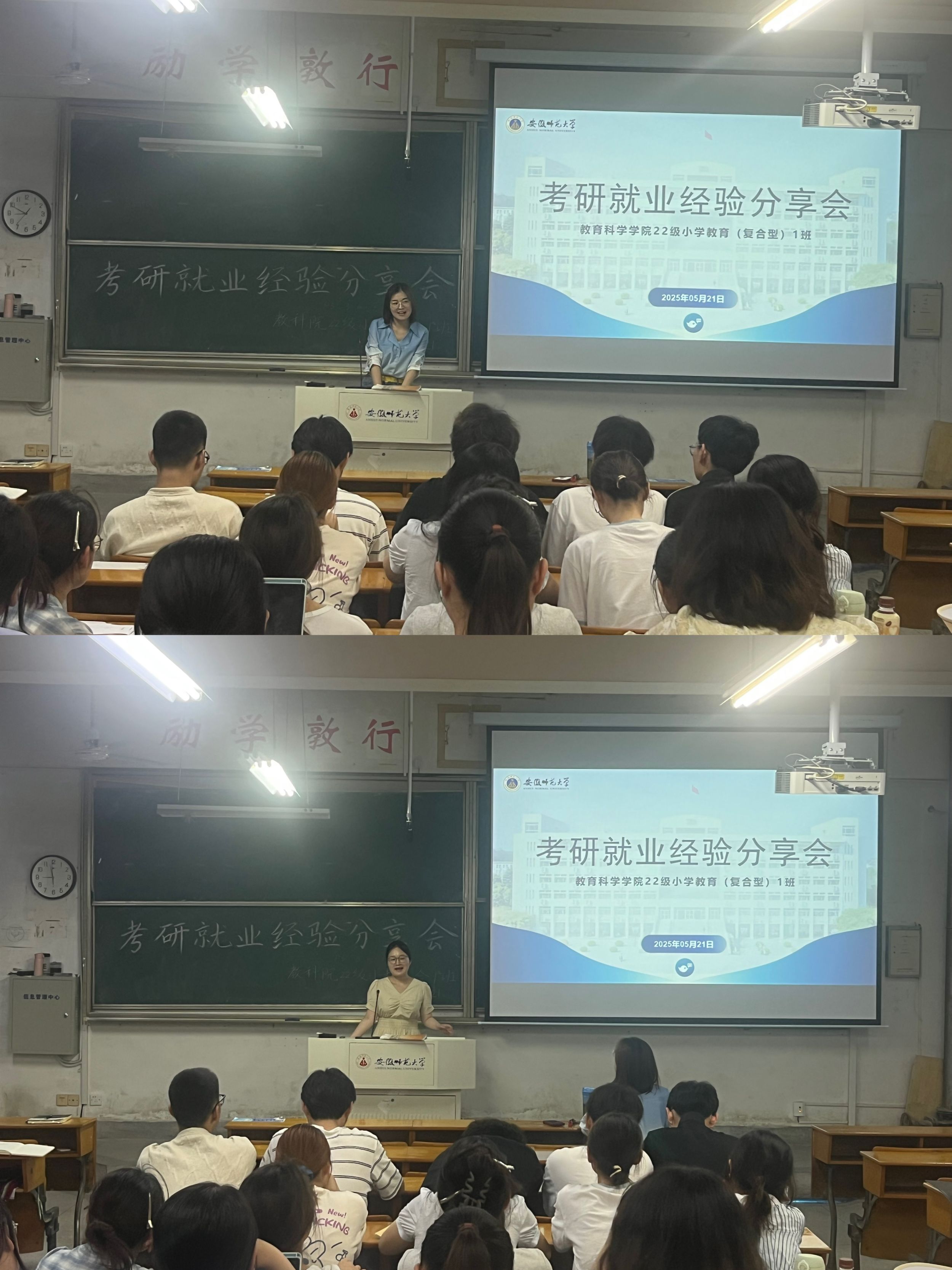 为助力学生更好地规划未来学业与职业发展,2022级小学教育(复合型)专业于2025年5月21日晚上18:30在田楼8102,召开升学就业经验分享交流会。本次会议邀请到小教复合专业负责人陈晨、教育学专业负责人陈娜,辅导员程雅楠老师莅临指导,以及21级优秀学生代表分享推免、考研与考编的经验。