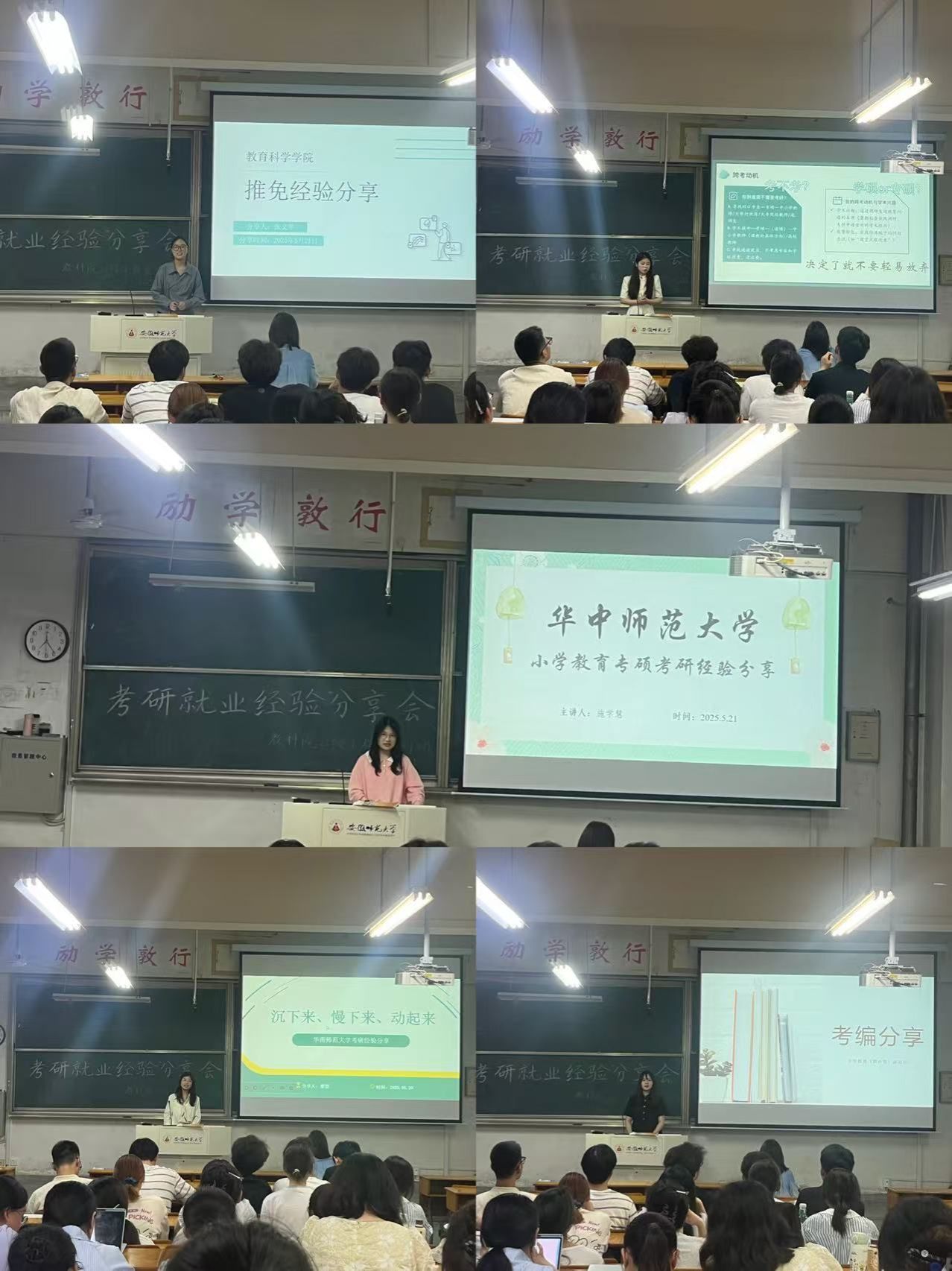 活动第一项,经验分享——干货满盈,启迪智慧。张义苹学姐以自身成功保研至华东师范大学的亲身经历为蓝本,从推免准备的每一个细节入手,详细讲解了如何积累科研成果、提升专业成绩、获得导师推荐等关键环节。她不仅分享了推免流程中的注意事项,还针对同学们可能遇到的困难给出了切实可行的建议,让同学们对保研之路有了更清晰的认识。周睿、施学慧、黎慧三位学姐则聚焦考研,围绕考研初心、择校策略、时间规划以及备考方法等方面展开了深入分享。学姐们的分享让同学们对考研有了更系统、更深入的了解,为有考研意向的同学指明了方向。邵语秋学姐结合自己多次参与校招、社招并成功上岸教师编制的丰富经历,从考情分析、简历制作到面试技巧到等方面,为同学们提供了全方位的建议。学姐的分享让同学们对教师编制考试有了更直观的认识,增强了大家备考的信心。此外,还有众多学长学姐通过精心录制的视频,向22级的学弟学妹们传授了升学与就业的心得体会。他们或分享自己在实习备考中的收获与成长,或讲述自己在求职过程中遇到的挫折与应对方法,让同学们感受到了学长学姐们的真诚与关怀。