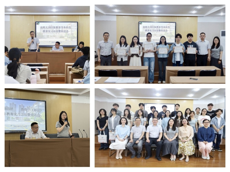 5月16日至20日,365英国上市官网2021级教育学专业的41名本科生圆满完成在安徽师范大学附属小学中校区、文昌西路校区、崇文分校及清华附中合肥学校四个实习基地为期12周的教育实习任务。实习基地如期举行2021级教育学专业教育实习总结大会暨实习欢送仪式,实习学校领导、实践导师、教科院教师以及实习生参加。