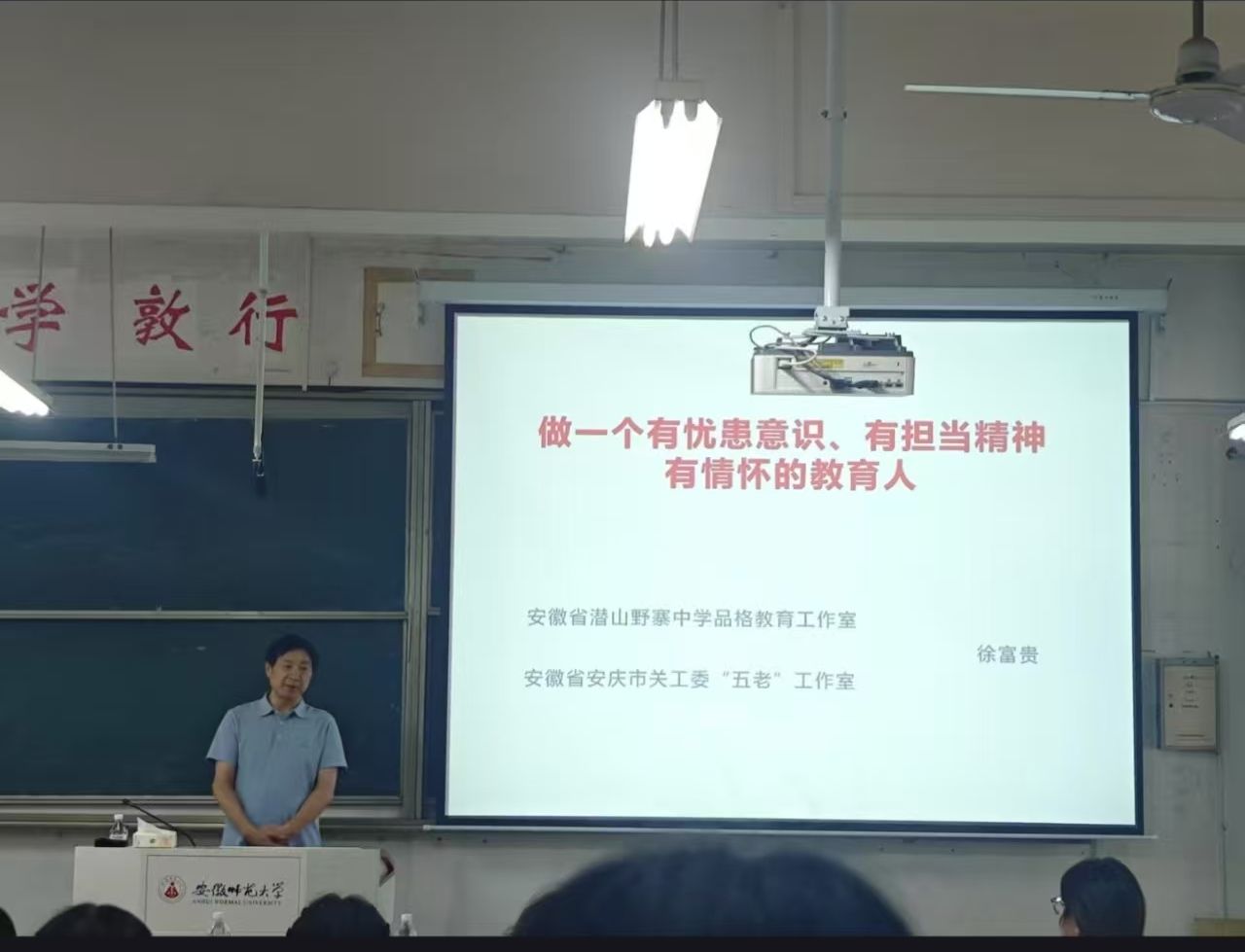 教育学专业于2025年5月24日上午9:00在田楼8102成功举行第十九场《教育改革前沿讲座》特色课程。本次讲座邀请的主讲嘉宾为安徽省潜山野寨中学原副校长、党总支副书记徐富贵担任主讲人,教育学专业24级全体本科生参加,杨俊铨博士主持。