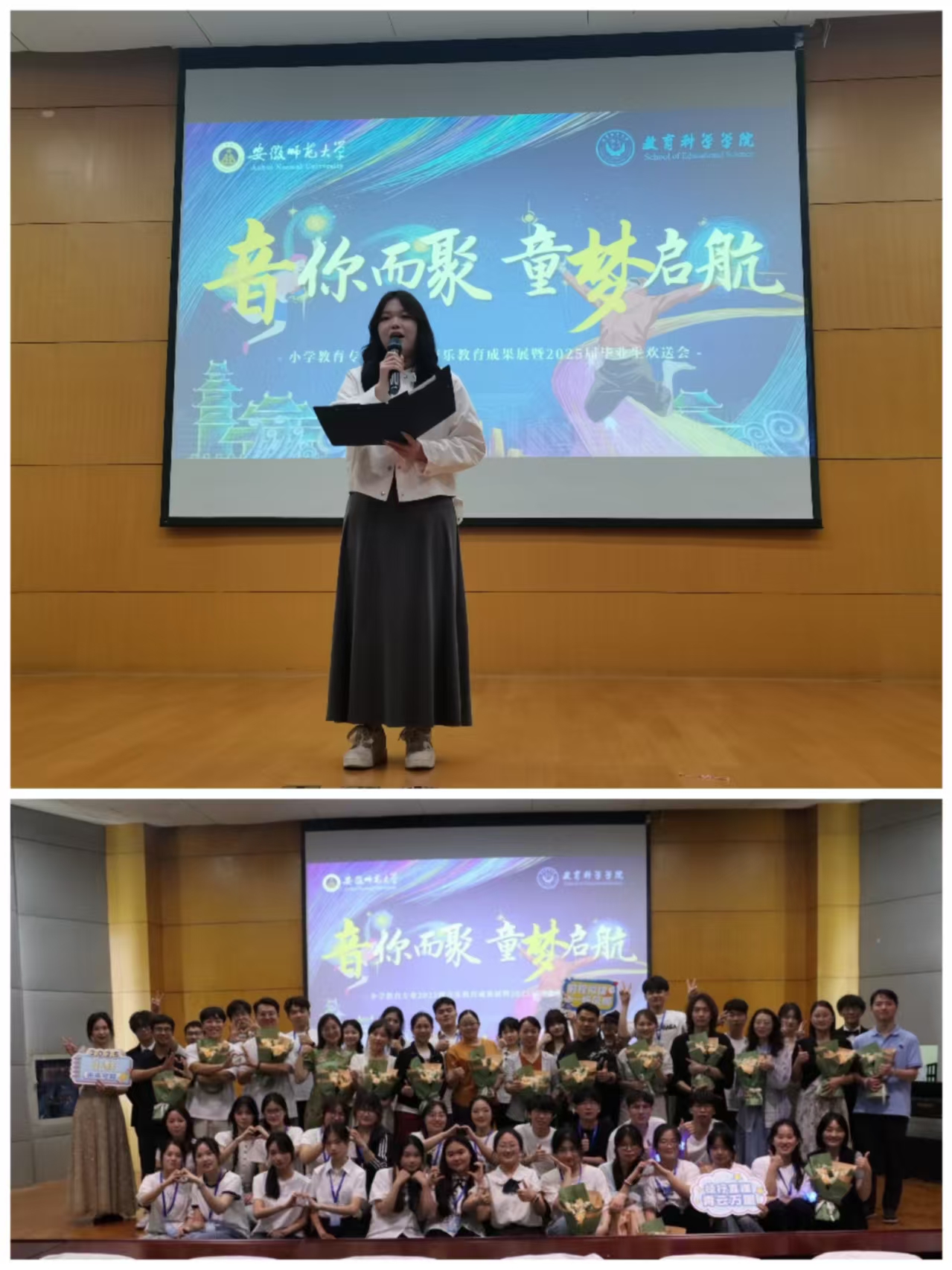 初夏时节,乐声飞扬。2025年6月8日晚,2023级小学教育(全科型)专业音乐教育成果展演暨2025届毕业生欢送会隆重举行。本次活动以“音你而聚,童梦启航”为主题,2023级学生用他们的音乐素养、专业能力,为现场观众奉献了一场精彩纷呈的艺术盛宴。