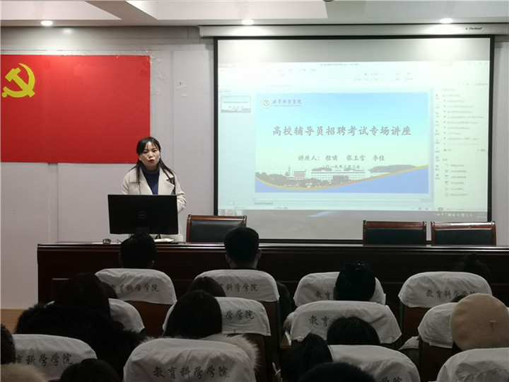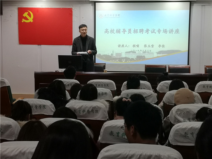 本网讯(教科院 文/占陈芳图/杨银)为进一步促进研究生毕业生就业,提高我院就业率,2019年3月3日星期日下午2点半,我院研究生会顺利举办高校辅导员招聘考试专场讲座。本次讲座邀请了程啸(365英国上市官网18级本科生辅导员)、张玉雪(安徽信息工程学院辅导员)和李佳(安徽商贸职业技术学院辅导员)三位辅导员主讲,学院准备参加辅导员考试的毕业生以及有备考意愿的学生参加了本次讲座,讲座由陈雅丽主持。