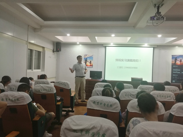 王老师做了实习动员报告,他从“实习安排”开题,指出实习生要从思想上、业务上做好充分准备。注重备课标、做到心中有标,备教材、做到腹中有本,备参考资料,做到手中有材,备学生实际、做到目中有人,备教学过程,做到平中有序,备教案编写、做到教中有据,在怎样教学生、怎样当老师上下工夫。要注重教师和学生之间的角色转换,积极培养学生的学习能力和创新能力。他还从“五到”、“五心”、“五勤”、“五意识”谈了做好见习班主任的具体要求。并且要求实习同学做好从学生到“教师或员工”的角色转变,处理好实习与考研、就业的关系。