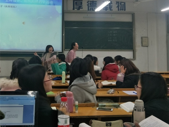 第二个问题韵律教学活动的设计、组织。杨园长介绍了傻瓜流程:故事→动作→音乐→其他(乐器、层次性),韵律活动又有三个方法:从“队形”开始的设计、从“动作”开始的设计、从“音乐”开始的设计。在杨斌园长授课之前,我们班同学们提供了一些自己喜欢音乐素材,杨斌园长现场即兴进行设计,她选择了《带你去旅行》这首欢快、节奏感强的歌曲,将其设计为一节韵律活动——双圈舞,因为教室的场地有限我们并没有做出队形,但音乐和动作的配合让同学们体会到了韵律活动的快乐。《倒霉的兔子》也是由队形双圈舞开始的韵律活动,杨园长和赵老师在讲台前合作示范,将动作游戏与音乐相结合,让我们也深受感染不知不觉参与在其中。前面都是由队形开始的设计,接下来这首是动作模仿、生活观察的韵律,首先杨斌园长给我们看了卓别林的一个电影片段,视频中卓别林将音乐与刮胡子结合起来显得十分的滑稽有趣,我们也用这首曲子与按摩相结合进行了游戏。在游戏过程中因为情绪的高涨我们有很多次忘记了音乐,幼儿往往也会是如此,杨园长提醒我们要不忘初心,这始终是一节音乐课,不能因为忘情的游戏而忘记了音乐元素。最后杨斌园长还选择了《克罗地亚狂想曲》,让同学们即兴创编。大家想出的“写书法”的模仿模仿动作来表现音乐,虽然不完善但还是为我们本次的活动画上了一个圆满的句号。