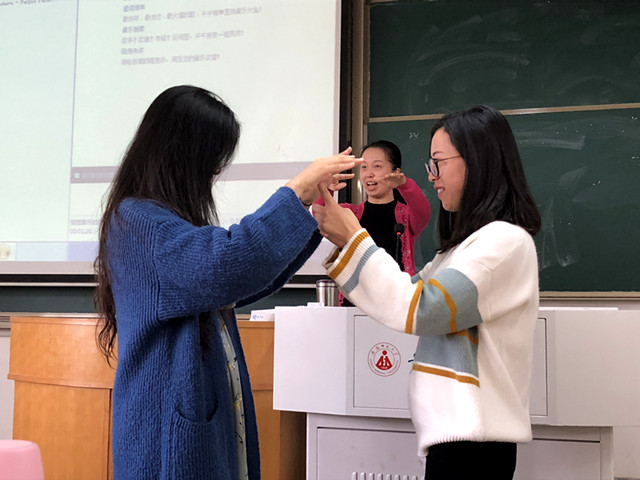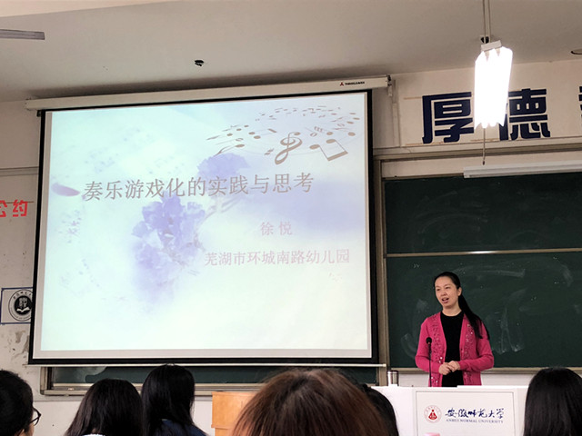 本网讯(教科院 姜雪)2017年11月2日下午,在田楼8202教室,赵学菊老师邀请芜湖市环城南路幼儿园的徐悦园长走进2015级学前本科课堂,结合《学前儿童音乐教育》课程为同学们带来一场生动活泼的实践教学。