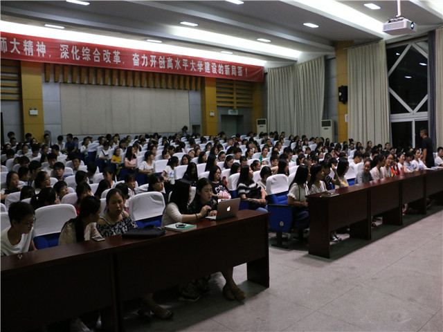 本网讯(教科院 张启山)齐聚缤纷校园,学子圆梦大学。9月9日晚上七点,教科院于田楼三楼报告厅召开2017级全体新生班会。出席本次班会的有院党委副书记张如华,新生辅导员谭茹轩。本次会议由谭茹轩老师主持。