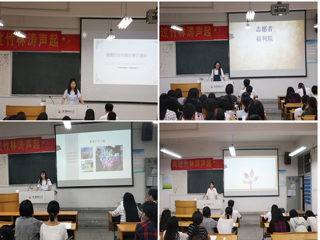 为了让2017新生了解暑期社会实践活动,增加社会实践经验,926日晚七点半,学院于田楼84108102两个教室分别举办了暑期社会实践交流会。交流会伊始,春芽志愿者代表16级学前教育乔海迪对春芽志愿者活动基本内容进行了阐述,其中包括照顾自闭症儿童和敬老院老人。她真情流露地举出了活动中遇到的暖心事迹,并鼓励17级新生积极参加志愿活动,做到锻炼自己、服务他人。在两位志愿者代表讲述其志愿经历后,暑期社会实践团队代表15级学前教育专业温梓漪简要介绍了“全心全益”广东省河源南湖幼儿园“健康伴我行”团队。通过一个简短的视频介绍了致力于社会实践的志愿者们和老师们,展示了他们丰富的社会实践工作经历和工作后的感悟。流会的最后,代表们对17级新生寄予了希望,让他们积极参与到实践工作中来,从而为大学生活添上浓墨重彩的一笔。
