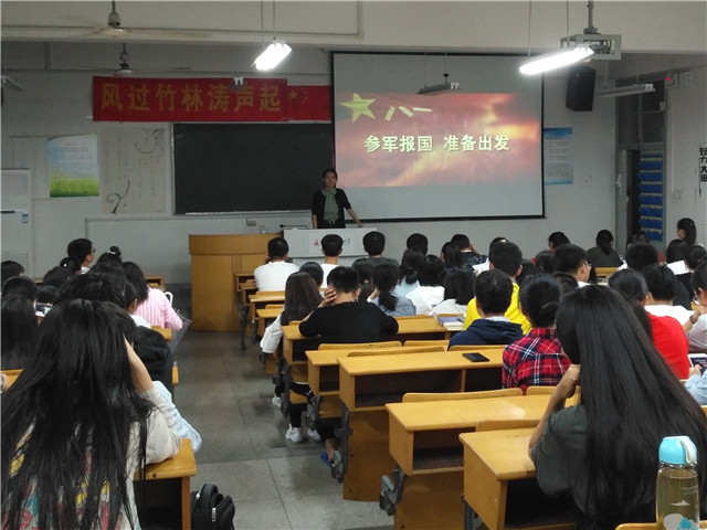 17级辅导员谭如轩老师就大学新生入伍做了简单宣传。她向新生们展示了国防部制作的2017年大学生入伍宣传片,视频中“冷面教官”刘金沂为大学入伍新兵代言,并列出一大批大学优秀入伍兵。他鼓励地方高校新生积极参与,成为国家军队的中坚力量。他还说到中国军队发展的良好进程,提出会为有素质的大学生提供良好的平台,鼓励新生积极入伍。