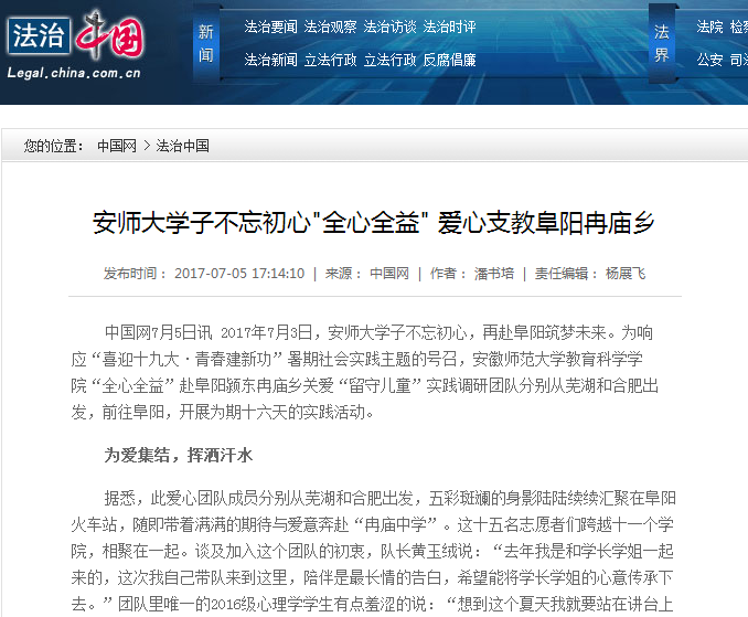 2017年7月3日,安师大学子不忘初心,再赴阜阳筑梦未来。为响应“喜迎十九大·青春建新功”暑期社会实践主题的号召,365英国上市官网“全心全益”赴阜阳颍东冉庙乡关爱“留守儿童”实践调研团队分别从芜湖和合肥出发,前往阜阳,开展为期十六天的实践活动。