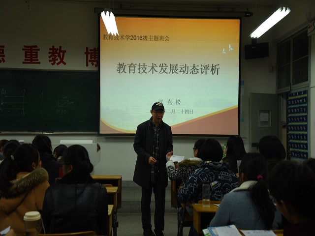 会上,张克松老师首先给16级教育技术本科生讲述了自己年前到美国的伯克利大学与俄勒冈大学两所大学的访学经历,张克松老师就这两所大学的办学条件、教学设施以及学习环境等作出了讲解。随后,张老师和全体本科生分享了在这两所大学的专业学习心得与体会。会议最后,张克松老师给同学们解析了教育部颁发的《教育信息化 “十三五”规划》,着重强调了智慧校园、在线学校、教育信息一体化等内容,使同学们对教育技术的发展前景有了更加深入的了解。