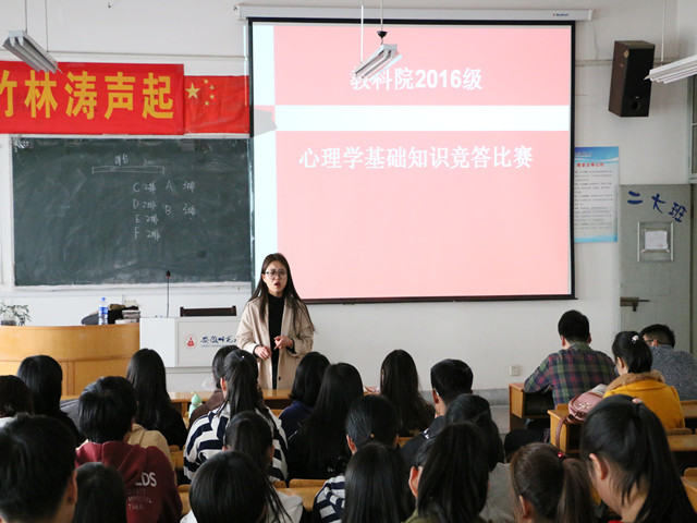 本网讯 (教科院 文\鲍旭婷 图张启山)为了提升学生专业兴趣,夯实心理学基础,3月27日下午,2016级心理学和应用心理学共70余名同学在田楼8410举办了首届普通心理学基础知识竞赛,辅导员朱雨雁参加指导。
