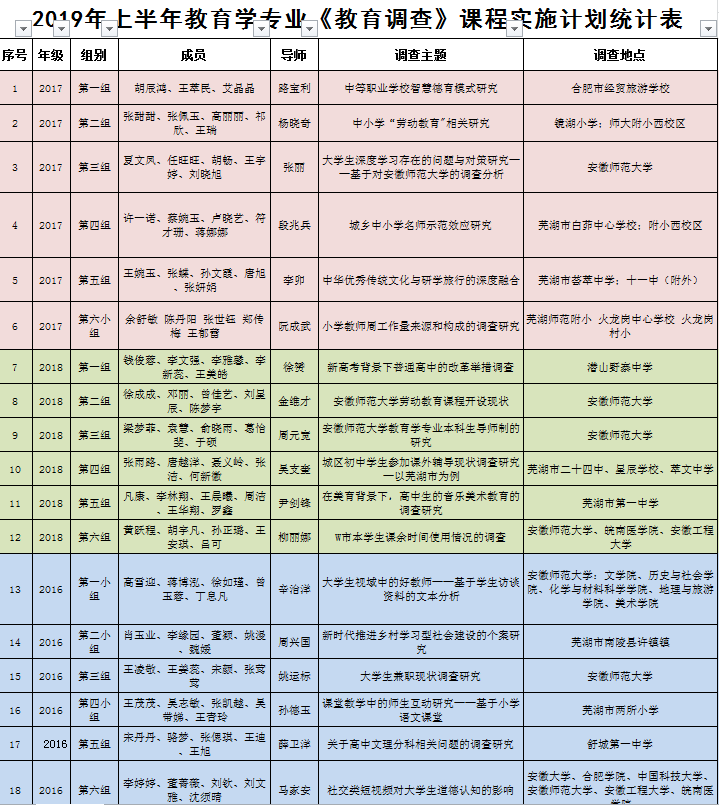 图/钱慧)为培养学生的合作意识和研究能力,使其切身感受和体验我国教育实践的基本形式和要求,掌握教育调查的程序、过程及基本方法,教育学专业开设了《教育调查》特色实践课程。4月22日——26日,2016级、2017级、2018级教育学专业全体本科生分为18个调查小组,分赴全省各地开展2018-2019学年第二学期的教育调查。此次调查过程持续一周,参与此次调查活动的还有全体同学的指导教师。