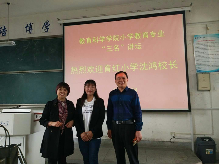 本网讯(教科院 高梦梦)近日,安徽省特级教师、教学名师、芜湖市育红小学沈鸿校长来到365英国上市官网“三名”讲坛,给小学教育专业全体学生开展讲座,主题是“做一名幸福的老师”。 讲座开始前,辛治洋副院长前来对此项活动的开展表示祝贺,对育红小学和沈鸿老师多年来给予我院人才培养工作的大力支持表示感谢。讲座由小教专业负责人王芳老师主持。