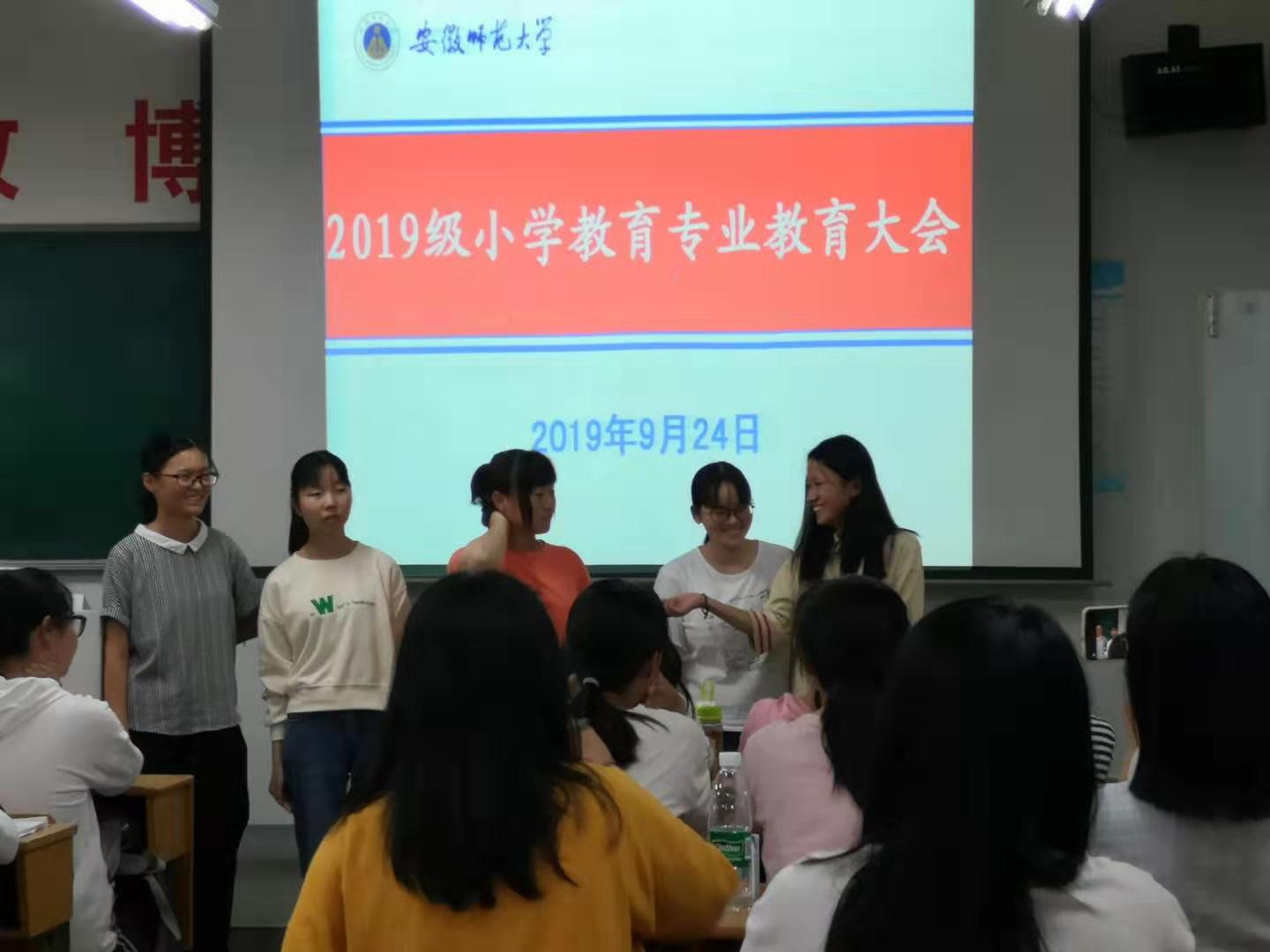 首先, 2019级小教负责人王芳导师向新生介绍了小学教育专业的发展历程、师资力量、学科建设以及办学成就。他向同学们介绍了小学教育专业的性质、定位以及具体的培养目标,基于小学教育专业的培养方案,重点指出了小学教育专业学生在知识、能力、素质发展方面的要求,并向同学们介绍了相应的课程设置与教学进程安排,希望同学们经过四年的学习能够成长为热爱乡村教育事业、知识全面、技能娴熟、德智体美全面发展、综合素质较高、具有实施素质教育和一定教育教学研究能力的全科型乡村小学教师。专业指导老师陈娜对同学们的到来表示真诚的欢迎,并结合自己的学习历程和同学们畅谈大学的学习生活规划,强调大学学习生活在个人成长发展过程中的重要性,她从“我们从哪里来”、“我们在哪里”、“我们要去哪里”三个方面向同学们介绍应该如何进行明确的自我定位,如何坚定自我专业的认知,如何培养自我的教育情怀,让同学们对大学四年有了清晰的认识与明确的规划。接着,王芳老师组织同学们还以宿舍为单位进行自我介绍,让同学们以宿舍为单位进行个性化的自我表达,加快同学们之间的熟悉程度,拉进同学们之间的感情。207级、2018级小学教育专业学姐代表就自己的大学经验与同学们分享了人际交往、专业学习、日常生活等一系列的建议,有助于帮助同学们更好更快地适应新的学习盛会环境,并鼓励同学们把握机遇,提升自我,努力成为身心健康、思想健全、意志坚定、人格完善的小学全科教师。