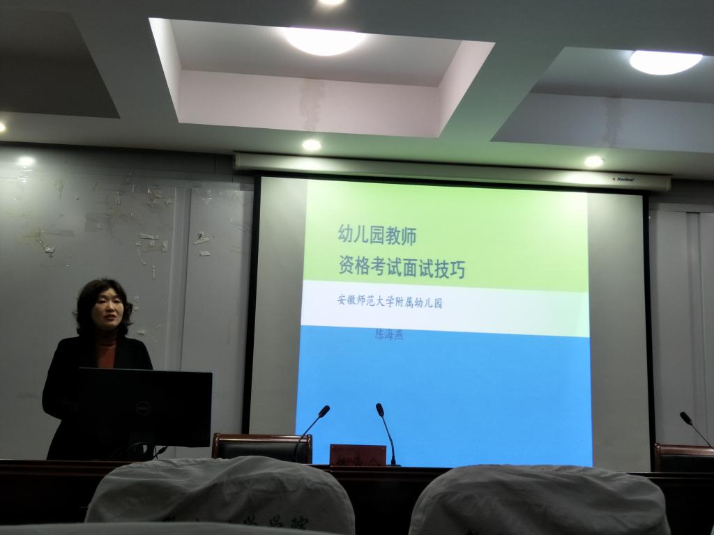 本讯网(教科院 李月)为了使学生能够全面掌握教师资格证考试面试流程及应考技巧,提高面试通过率,12月19日上午,我院特邀请了安徽省正高级教师、安徽师范大学附属幼儿园副园长陈海燕老师在学术交流中心为本次参加幼儿教师资格证面试的学前教育专业同学举行“2019幼儿园教资面试指导”专题讲座。讲座由我院学前教育专业负责人王路曦老师主持,2016、2017级学前教育专业同学参加了此次讲座。