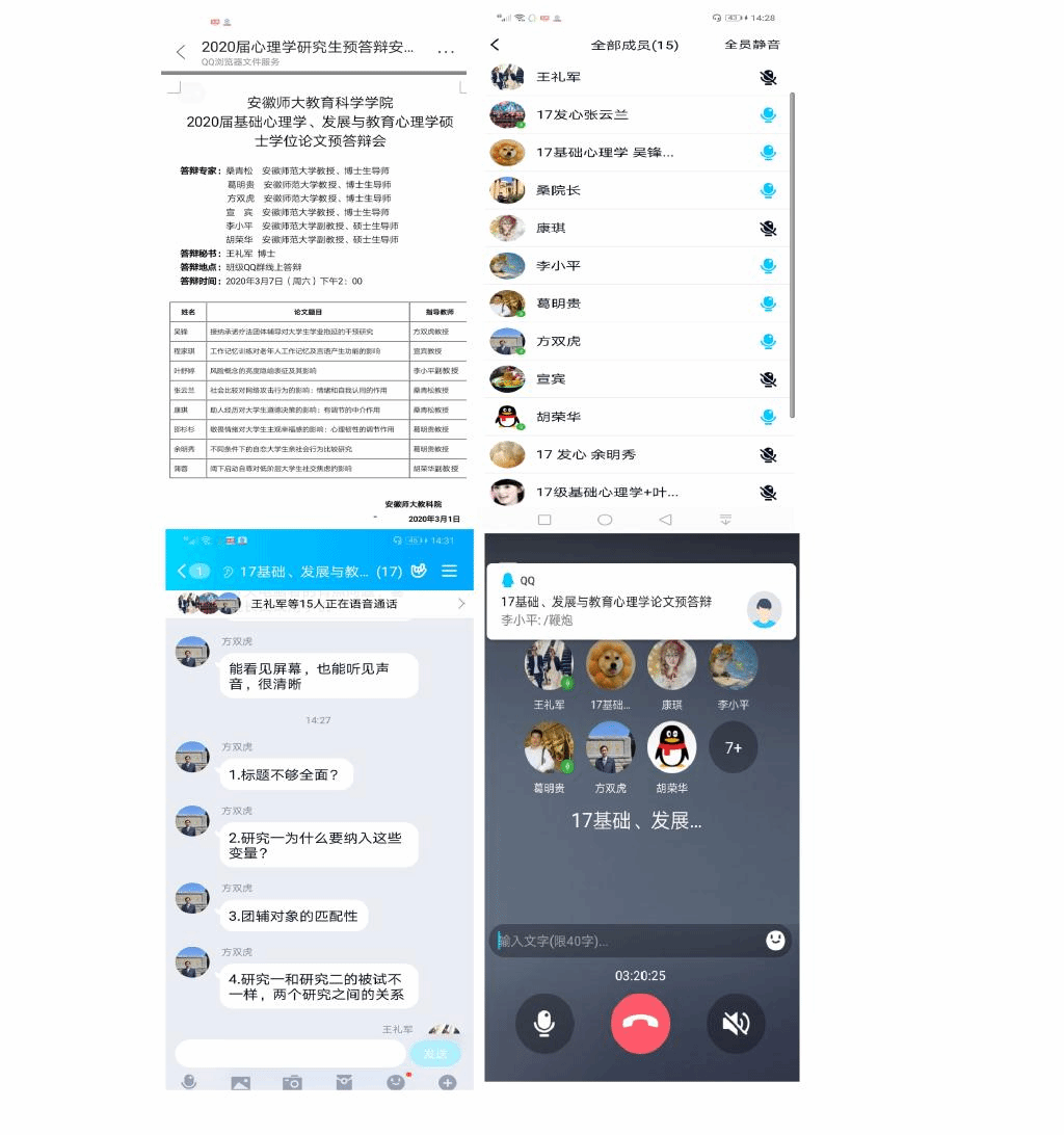 本网讯(余明秀,王礼军/文)在新冠肺炎疫情防控期间,为了使我院心理学2020届毕业研究生进一步完善学位论文、规范论文写作、提升学术水平,我院于3月7日下午举行了心理学硕士学位论文线上答辩会,会议由心理学专业的葛明贵教授主持,桑青松教授、方双虎教授、宣宾教授、胡荣华副教授、李小平副教授以及17级基础心理学和发展与教育心理学专业全体研究生共同参与,王礼军老师为本次线上预答辩的秘书。