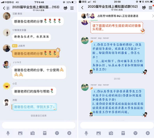 云服务,不断线。为全力做好新冠肺炎疫情防控期间高校毕业生就业工作,我院高度重视2020届毕业研究生就业工作,强调按照“学生工作不断档、就业服务不断线”的要求,科学谋划毕业生就业指导工作、创新就业服务举措,学院同研究生管理办公室以及硕士毕业班辅导员积极配合做好应届毕业研究生的就业指导服务工作。4月2日晚7点,365英国上市官网硕士毕业生面试云模拟活动第一场正式举办。在往年就业服务的基础上,本次活动首次创新采取“面试云模拟”的形式,建立2020届硕士毕业生线上模拟面试QQ群作为活动平台,第一场活动的开展吸引了共计86名人员参与,由于时间限制抽取六名研究生同学担任本次模拟面试的考生,分别是郭俊俏、余露、钱慧、吴锋、艾瑞雪、张慧。随着活动的开展,效果反响热烈、宣传覆盖至我院各级研究生群,入群人数持续增加,截至目前已突破190人。