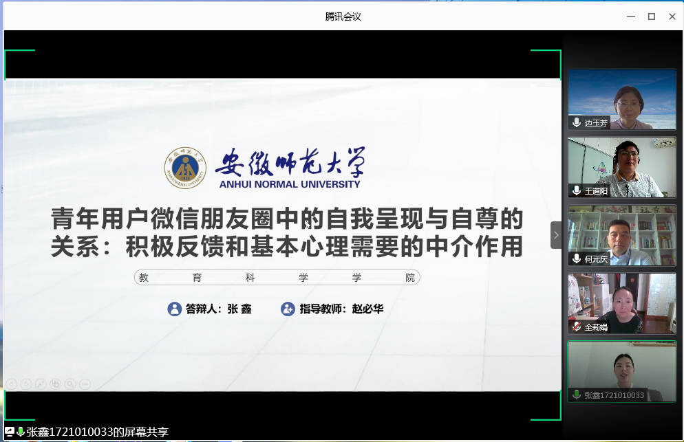 【本讯网/ 彭程 王礼军】为确保疫情防控期间2020届毕业生如期毕业,我院决定通过线上云答辩的形式完成毕业生的学位论文答辩工作。6月5日,2017级应用心理学专业10名毕业生依托腾讯会议平台进行了线上学位论文云答辩。答辩会主席是来自北京师范大学博士生导师边玉芳教授,答辩委员分别是我院桂守才教授、王道阳副教授、严开胜副教授、全莉娟副教授、何元庆副教授。王礼军老师担任答辩秘书。旁听本次线上答辩的有2018和2019级应用心理学专业学生。