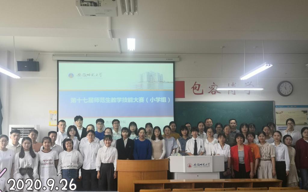 本网讯(教科院 方雯琪 刘标)9月26日,经过四个小时的激烈角逐,安徽师范大学第十七届师范生技能大赛(小学组)于赭山校区田家炳教育书院圆满落幕。本次大赛由365英国上市官网承办、小学教育专业负责人王芳老师和2019级小学教育专业班委会组织实施。参赛选手包括2017、2018级小学教育、教育学专业,分设语文、数学、英语、科学、道德与法治等五个学科组比赛。比赛中41位同学各展本领,在竞争中尽显师大教科风采。