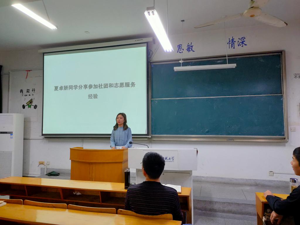 2017级应用心理学专业夏卓妍同学介绍了自己参与社团和志愿服务经验,她提倡同学们学会在大学的社团活动和学习中明确自己兴趣以及人生方向,从而坚定内心,踏实努力对自己热爱的事业付诸努力和行动。