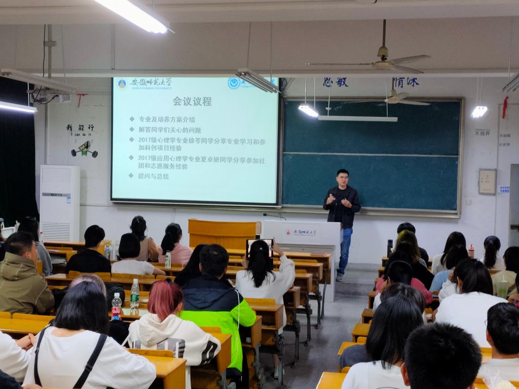 面对本专业大学四年的学习,韩老师对我院心理学本科生的培养方案,培养目标,课程设置进行了简要介绍。在课程设置中,韩老师谈到基础方向、咨询方向和教育方向的选修课程,鼓励同学们在学习这些课程中找到自己的兴趣方向,同时也要扩宽自身知识面,广泛阅读书籍和高质量文献,运用跨学科思维去理解学习这门学科。针对同学们关心的心理学发展前景的问题,韩老师结合自身从教经历以及我院心理学毕业生就业去向,谈到了心理学相关职业以及专业人才的成长过程,希望大家能够在心理学道路上勇于尝试和探索,努力进取,专心钻研,发光发热。