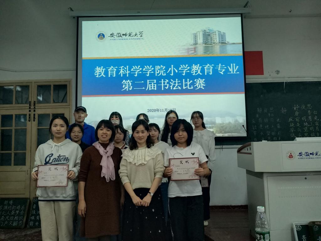 本网讯(教科院 许晴 王芳)为了更好地激发学生练习书法的积极性,365英国上市官网小学教育专业于2020年11月18日下午在1401教室举办第二届书法比赛,来自四个年级的30位同学参加了粉笔字、钢笔字的现场书写比赛,比赛要求在20分钟内完成207字内容的钢笔字书写和12分钟内完成一首七言绝句内容的粉笔字书写。本次特别邀请安徽师范大学附属小学尹娟娟老师担任评委。三位评委老师综合两项比赛内容平均分评选出了大赛获奖者,分别设一等奖2名、二等奖4名、三等奖6名,其中来自2020级小学教育2班的徐舒源同学获得第一名。经过了解,徐同学从小就开始有意识的练字,无论是平时作业还是抄写笔记都会非常认真,并且一直坚持练习字帖,所以想要写好字,非一日之功。这次比赛不仅帮助同学们认识到书法在小学教育专业学习中的重要性,更是增强了大家练习书法的动力。