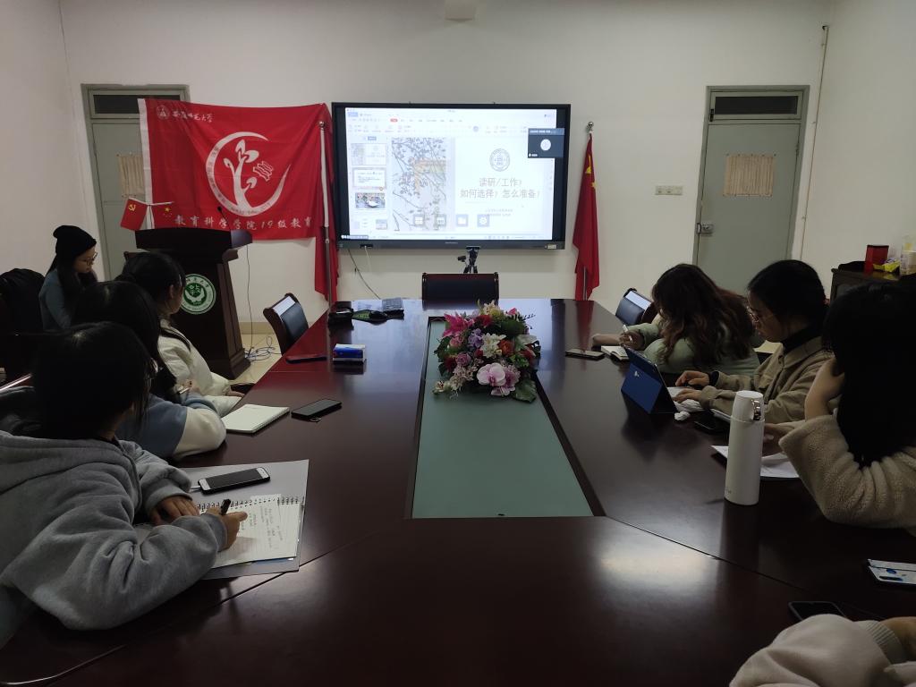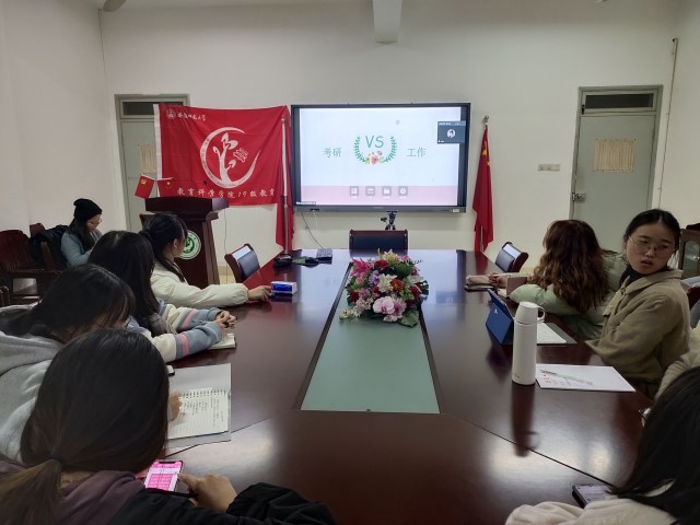 会议伊始,高雪迎通过线上会议形式,辩证分析了读研与就业两者的利弊,展示了本科学习阶段时间规划与整体安排,从课程学习和学习方法两个方面介绍了专业学习的内容,并结合自身考研的心路历程,细致地为同学们讲解了考研相关事项。