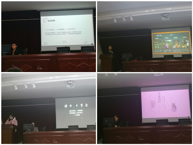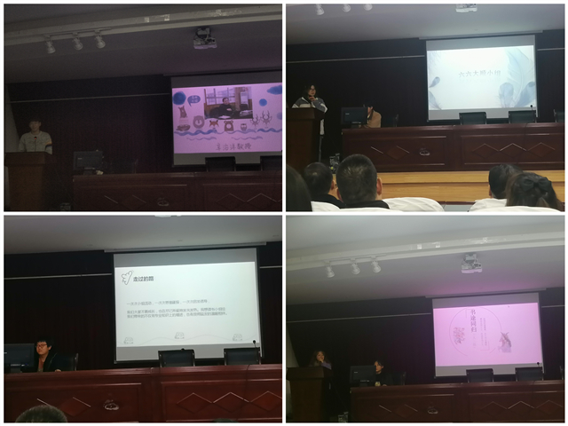 在主持人强调了会场纪律,并对汇报流程做了简要的说明后,小组汇报活动正式开始。首先,第一个上台汇报的是周元宽老师指导的橘猫小组,汇报人袁慧按照橘猫之名、可问春风、桃李不言、读过的书、走过的路、来日可期的脉络进行汇报。第二个汇报小组是姚运标老师指导的四美二男小组,该小组首先以一段快闪视频的方式让大家对他们有了大致了解,然后汇报人姚明惠汇报了小组的阅读情况。第三个汇报小组是李宜江老师指导的“三余”小组,汇报人申澳从导师及成员介绍、小组已读数目、小组生活碎片、专业论坛等四个方面进行汇报。第四个汇报小组是徐赟老师指导的胡萝卜小组,汇报人钱俊蓉按照成员介绍、小组活动、成果展示、未来展望的顺序展开汇报。第五个汇报小组是柳丽娜老师指导的六六大顺小组,汇报人孙正璐分别介绍了小组名字、导师介绍、成员介绍、获奖情况、读书情况及推荐书目等内容。第六个汇报的小组是滕曼曼老师指导的“书”途同归小组,该小组通过小视频、PPT等形式,依次汇报了导师与成员介绍、读书活动、小组成果。第七个汇报小组是尹建锋指导的牧羊人小组,汇报人王晨曦为大家介绍了小组成员、小组书单、小组推荐书目、小组读书笔记和未来规划。第八个汇报小组是薛卫洋老师指导的“惜字斋”小组,汇报人王燕围绕小组简介、小组历程、学习情况和阅读书目四个内容展开汇报。第九个汇报小组是陈娜老师指导的五枝精珠小组,汇报人张慧以组名内涵、导师及成员介绍、阅读历程、小组活动为序进行了汇报。第十个汇报小组是金维才老师指导的五朵金花小组,汇报人刘星辰从小组简介、小组学习、小组活动、小组寄语等四个方面进行汇报。第十一个汇报小组是吴支奎老师指导的无问西东小组,汇报人聂义岭从导师及成员介绍、所读书目与推荐书目、小组活动进行了汇报。最后一个汇报小组是辛治洋老师指导的书海拾贝小组,汇报人邵华从导师及组员介绍、读书情况、活动记录三个方面展开汇报。